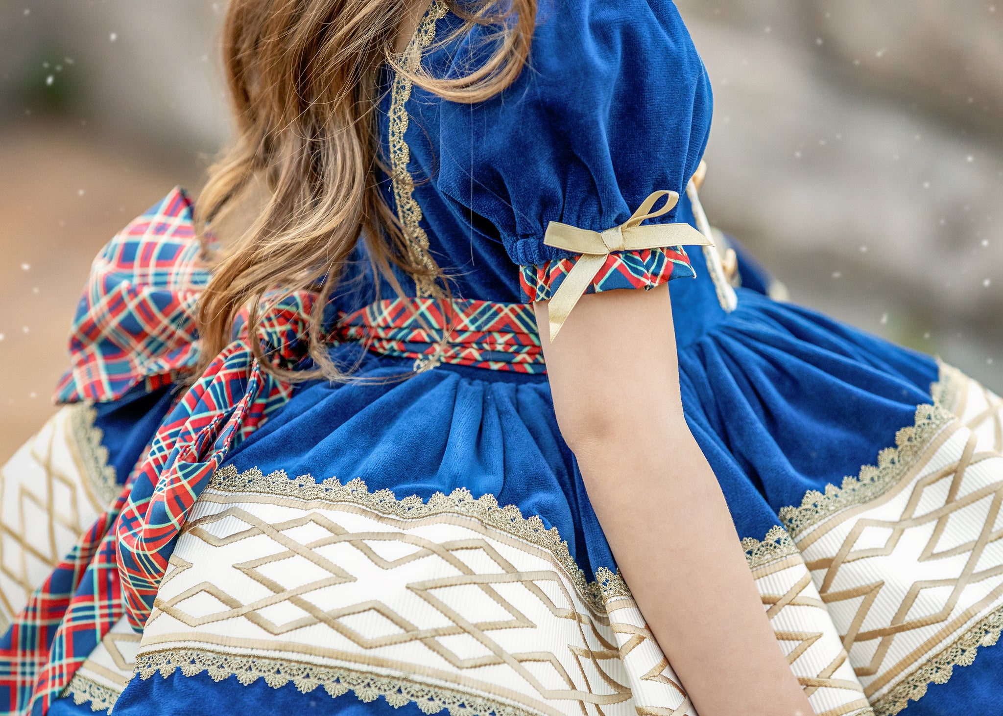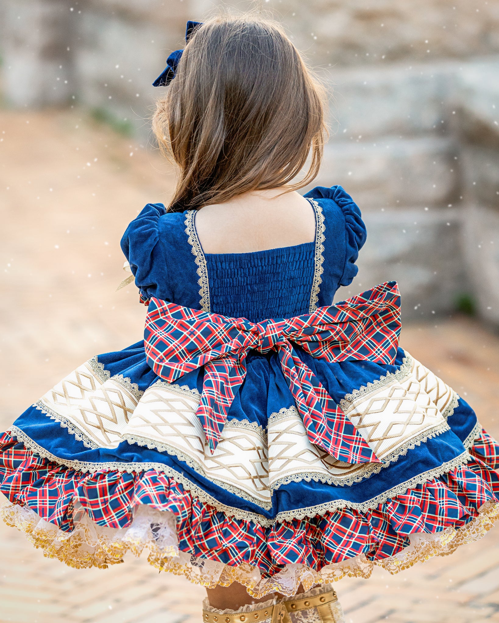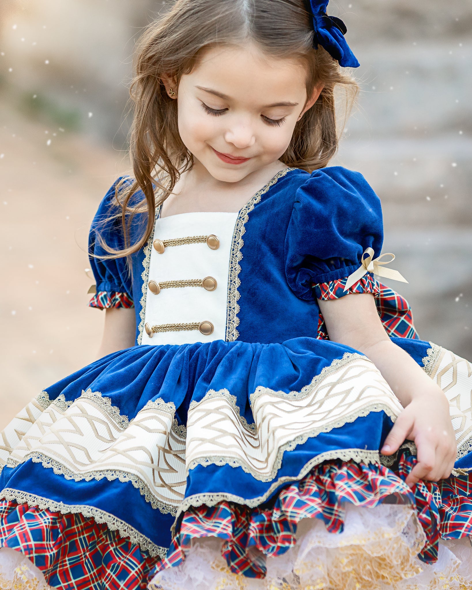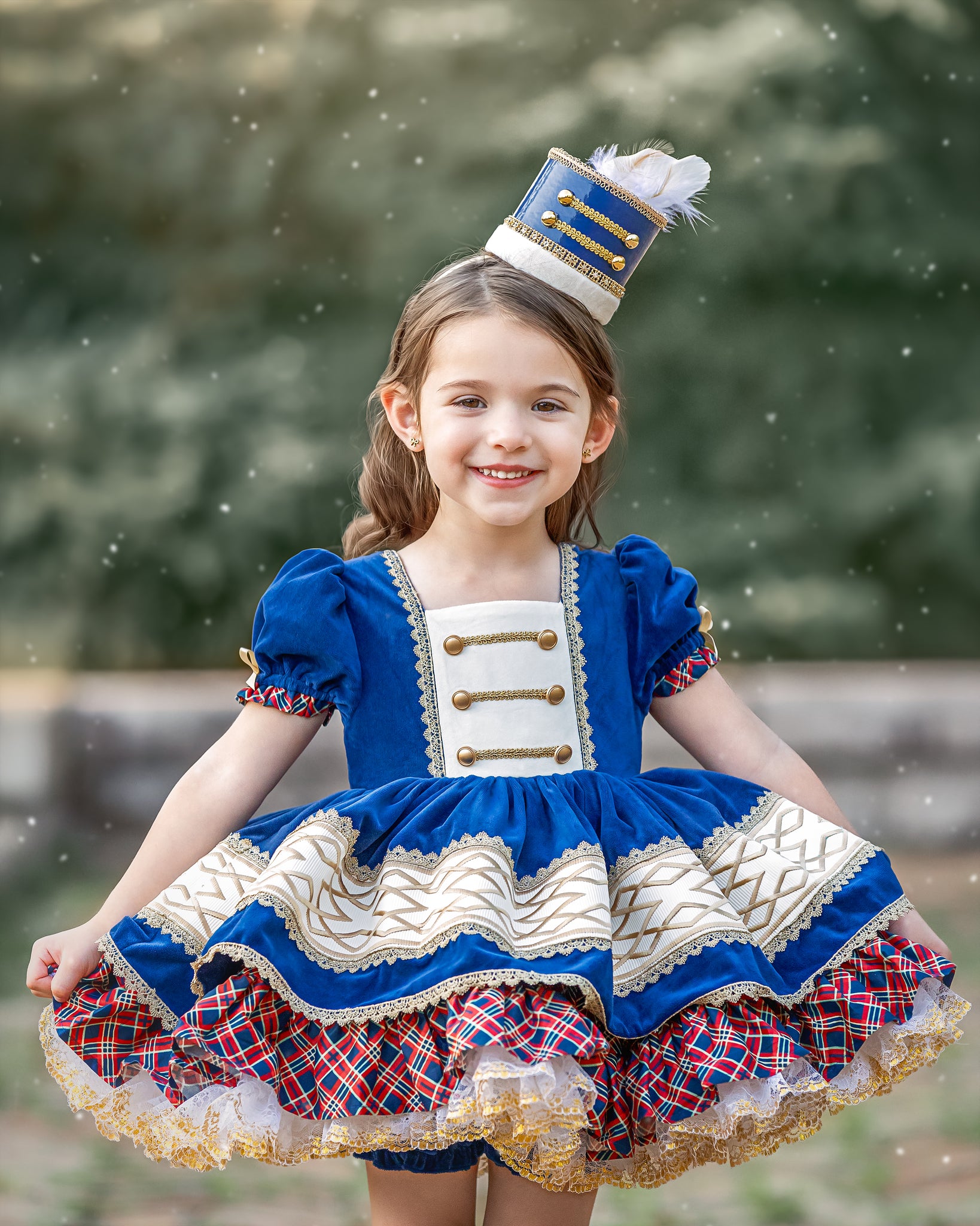This dress features luxe navy blue velvet fabric with solider-esque vibes. The bodice has faux buttons and trimming emulating nutcracker vest. The back is elastic and has a sash to tie into a bow. Skirt has velvet over skirt with ribbon and gold trim accent and plaid cotton underskirt. Comes with fully sewn in petticoat with luscious gold lace peeking out giving it just the right touch to sparkle. Comes fully lined with bloomers.