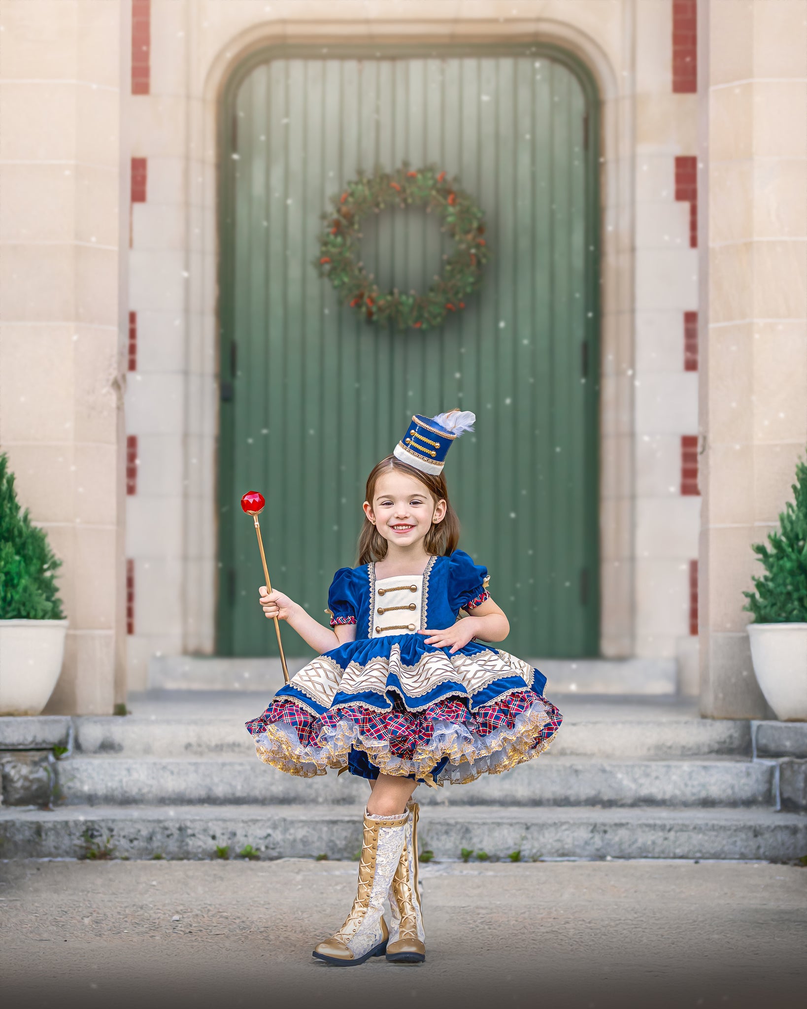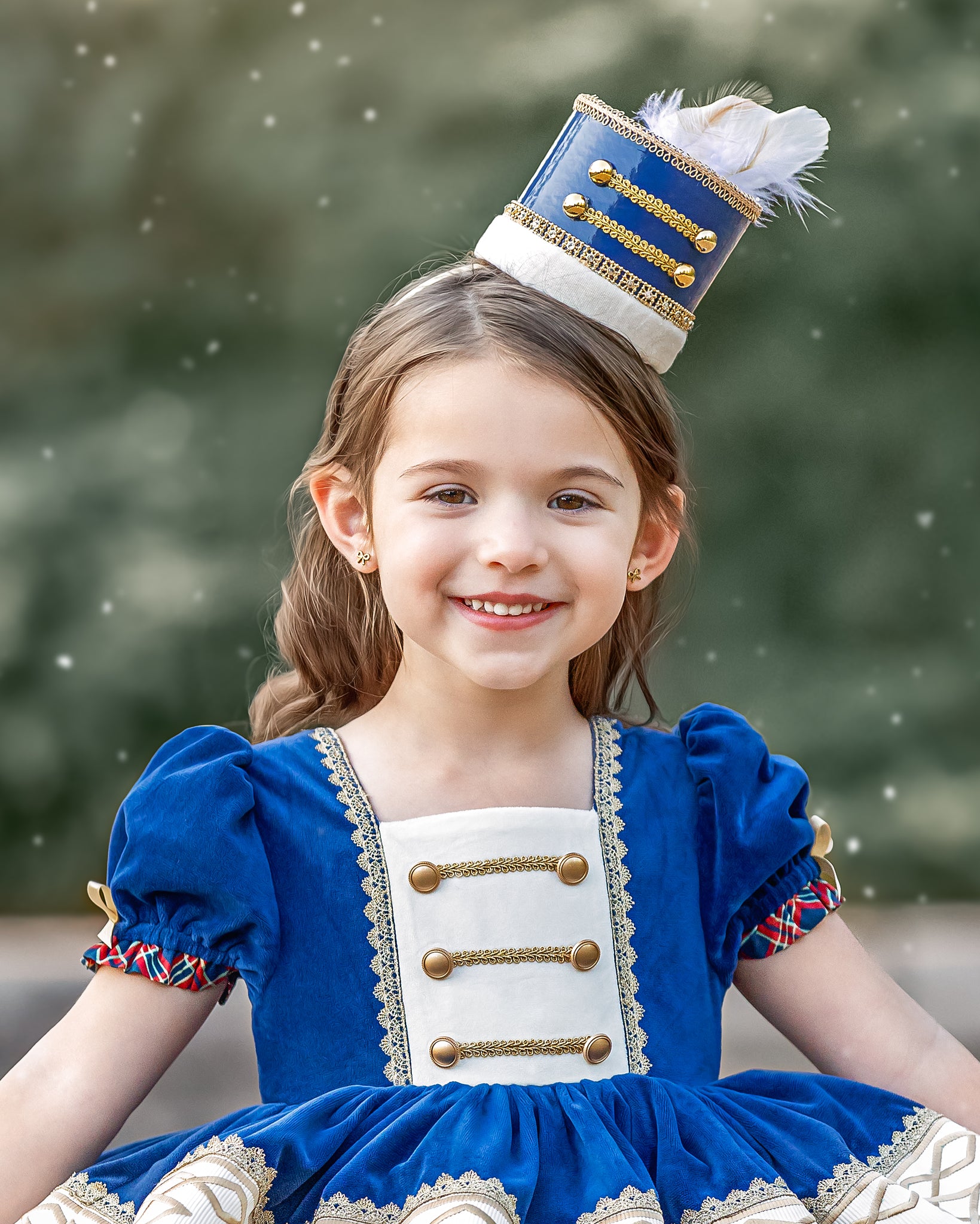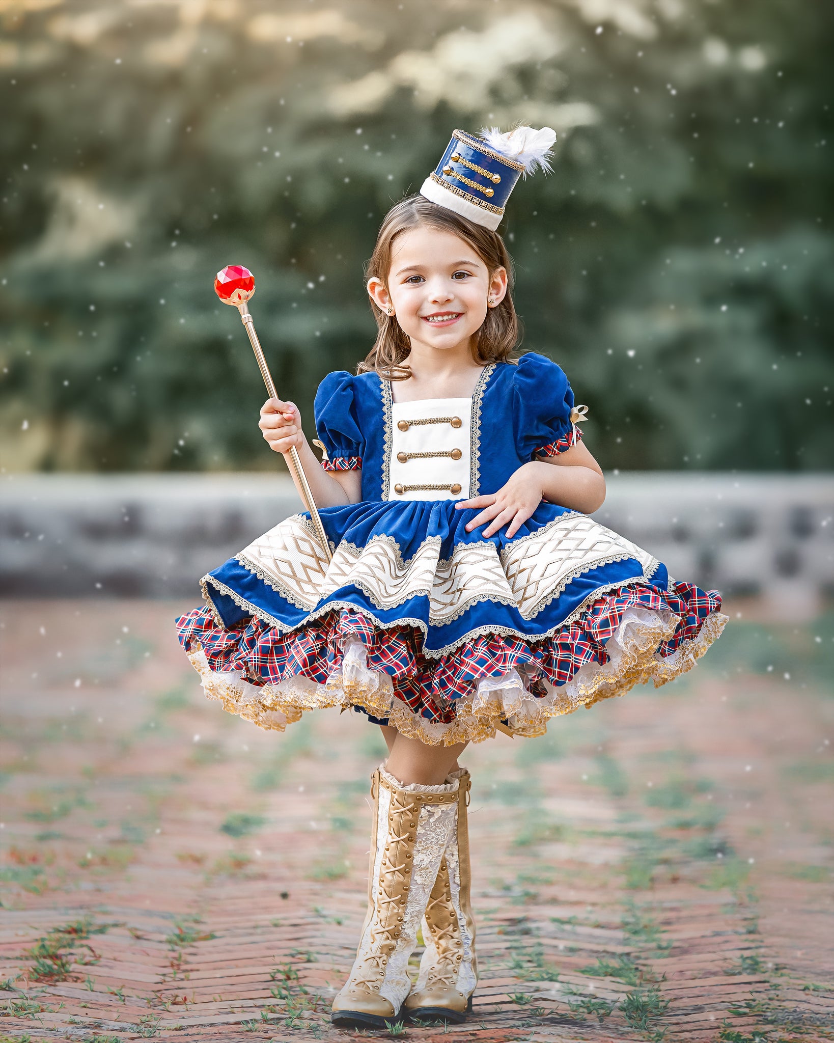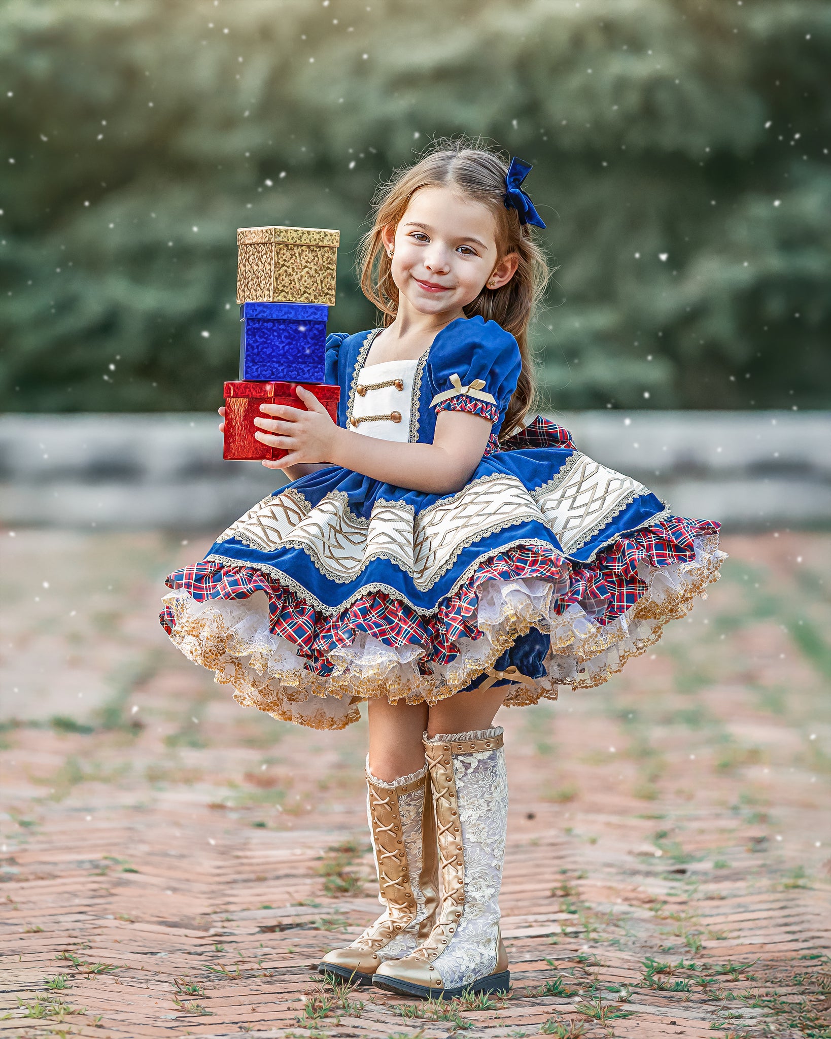 This dress features luxe navy blue velvet fabric with solider-esque vibes. The bodice has faux buttons and trimming emulating nutcracker vest. The back is elastic and has a sash to tie into a bow. Skirt has velvet over skirt with ribbon and gold trim accent and plaid cotton underskirt. Comes with fully sewn in petticoat with luscious gold lace peeking out giving it just the right touch to sparkle. Comes fully lined with bloomers.