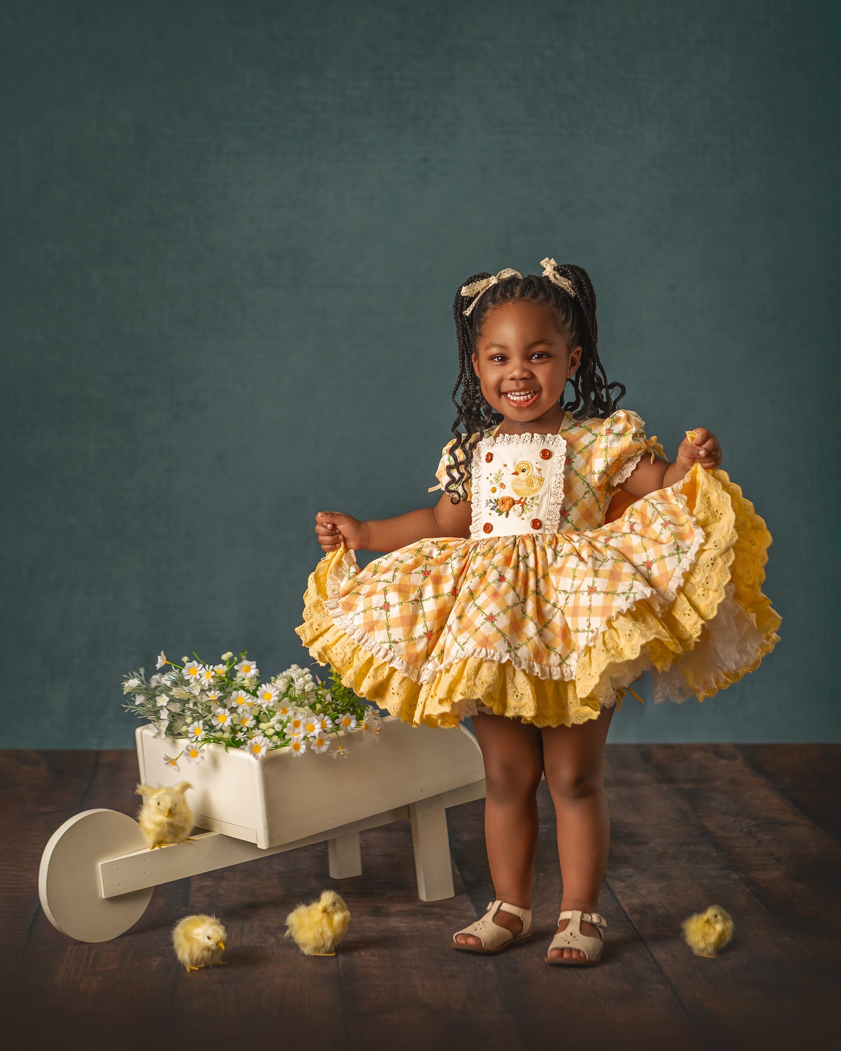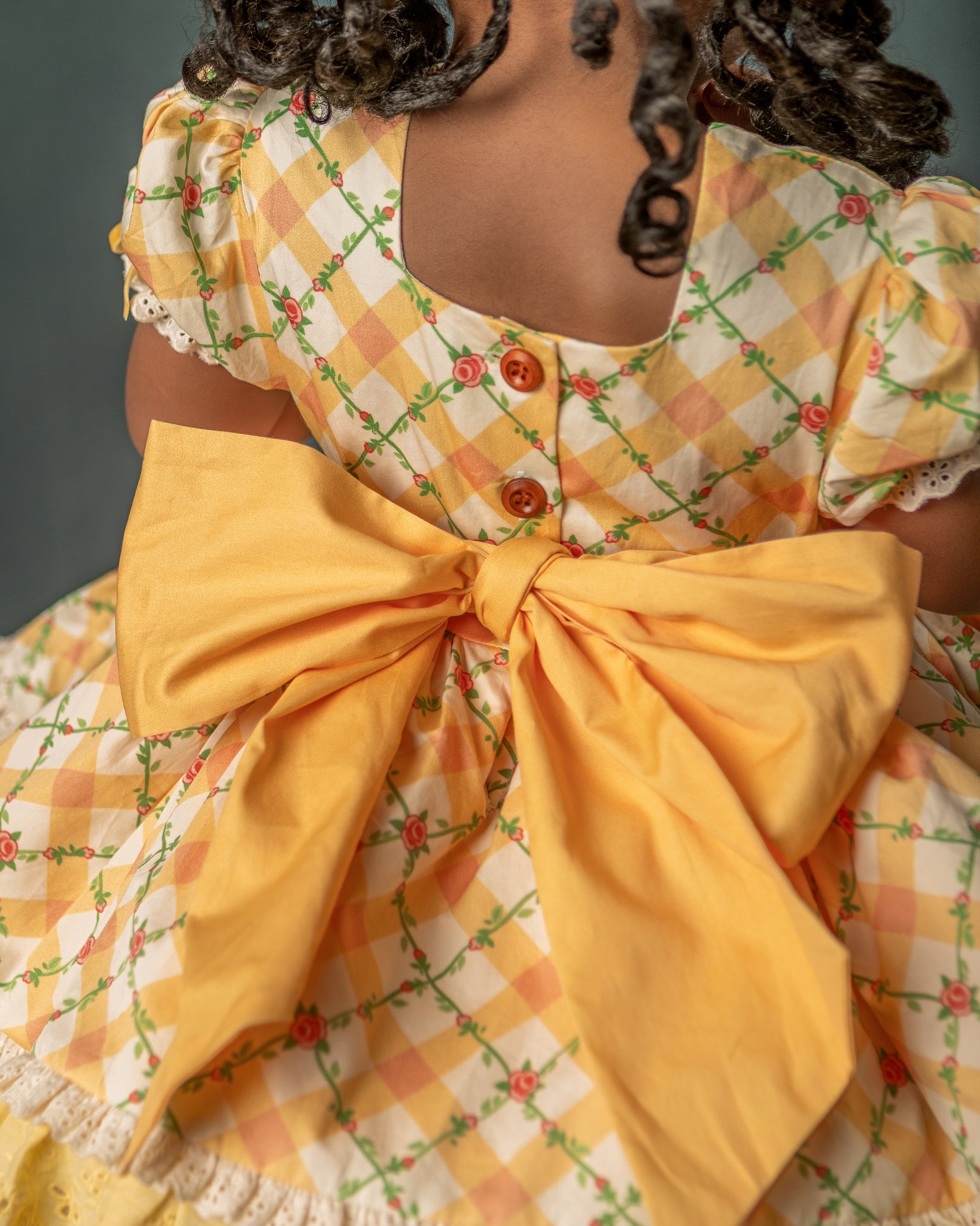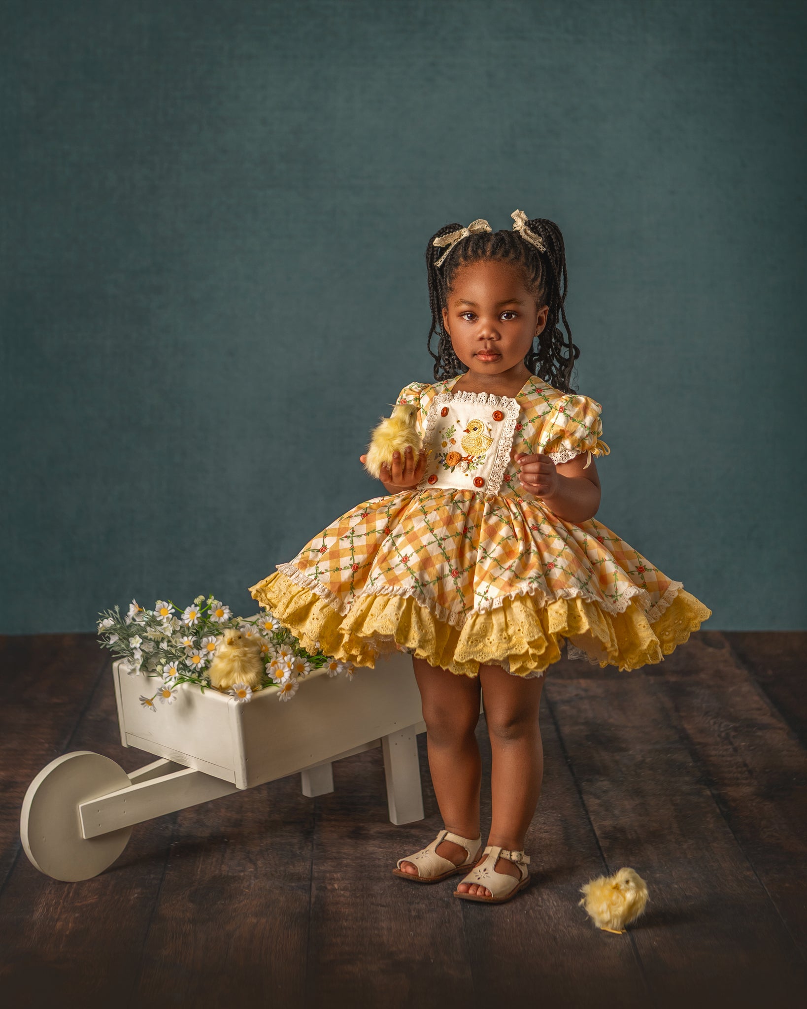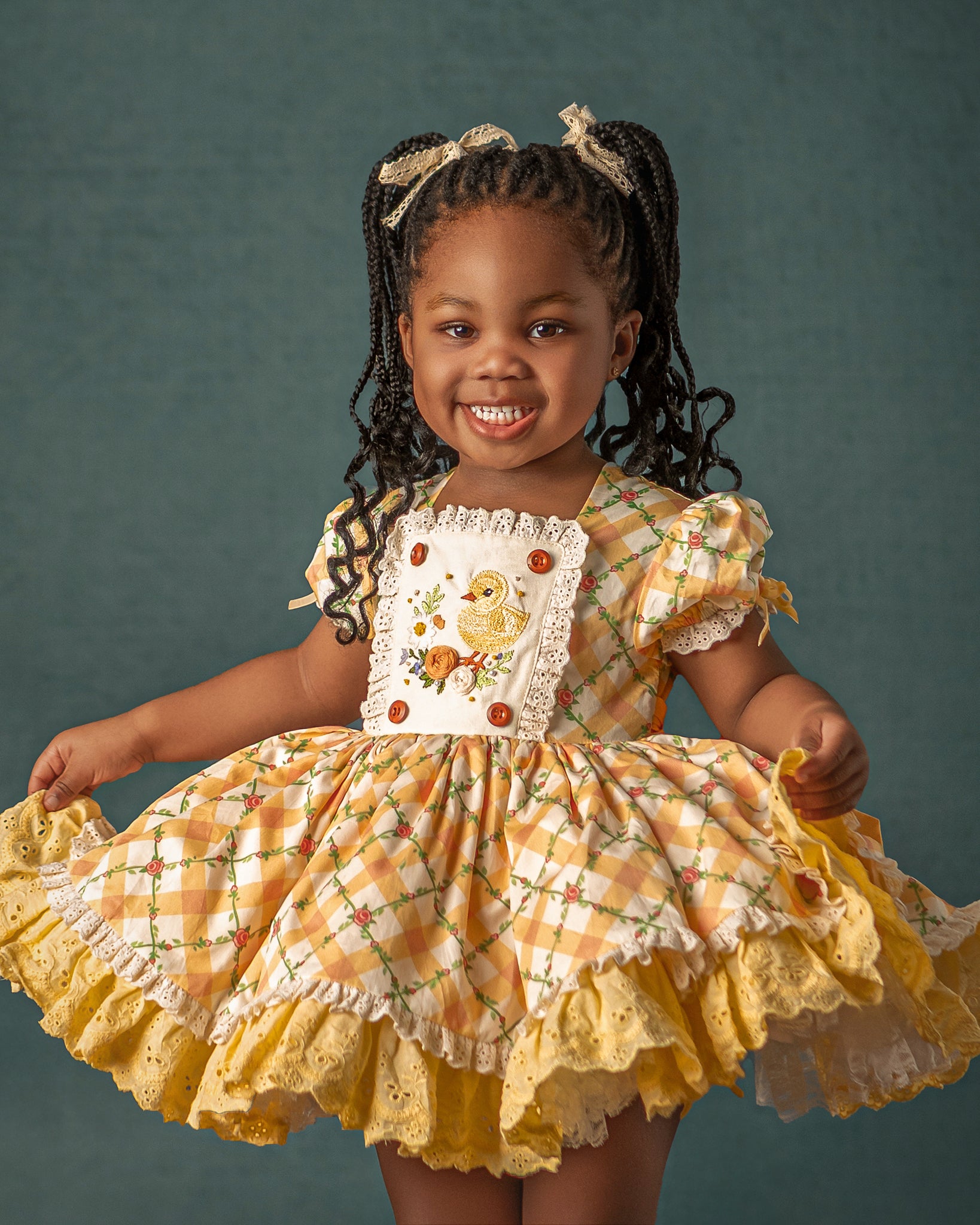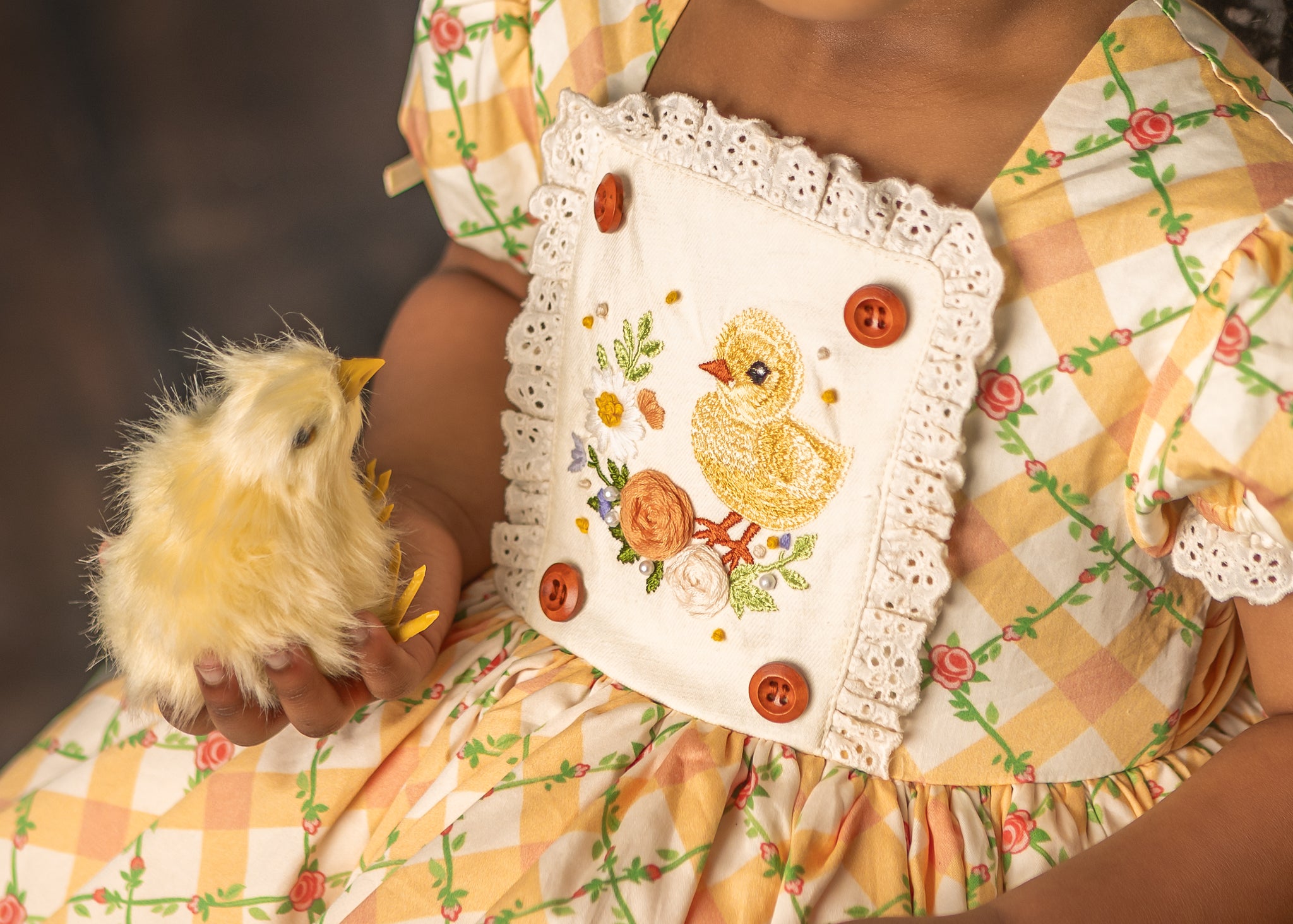 This adorable dress features lovely hand embroidery on the bodice with a chick and flowers. The bib accent has crochet trim and wooden buttons. The puff sleeves also include crochet trim and a bow. The back of the dress has wooden button closure along with a large bow for tying. Skirt has crochet trim along the hemline and also features an underskirt with eyelet trim in golden yellow hue. Dress is fully lined with a sewn in petticoat and comes with bloomers!