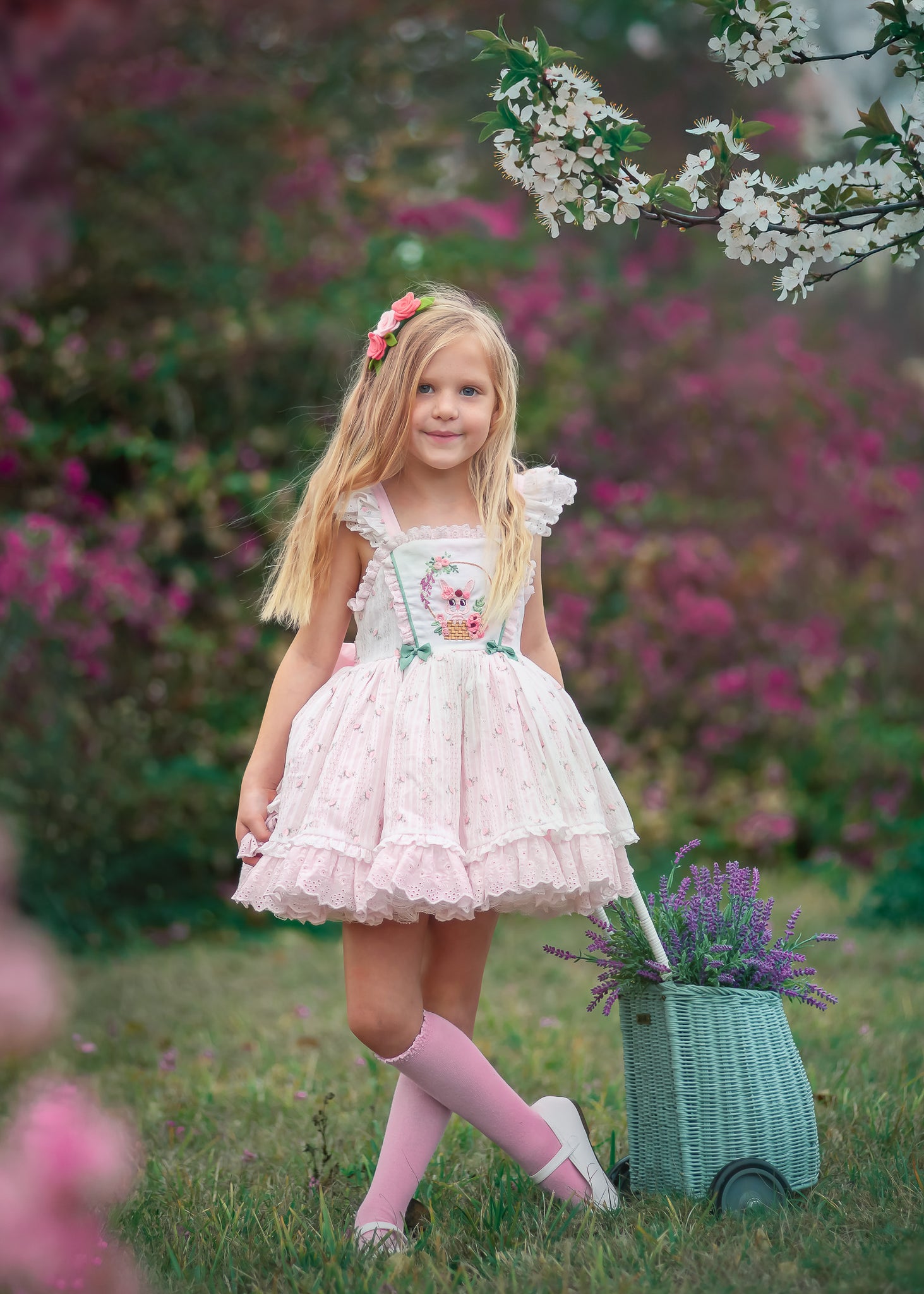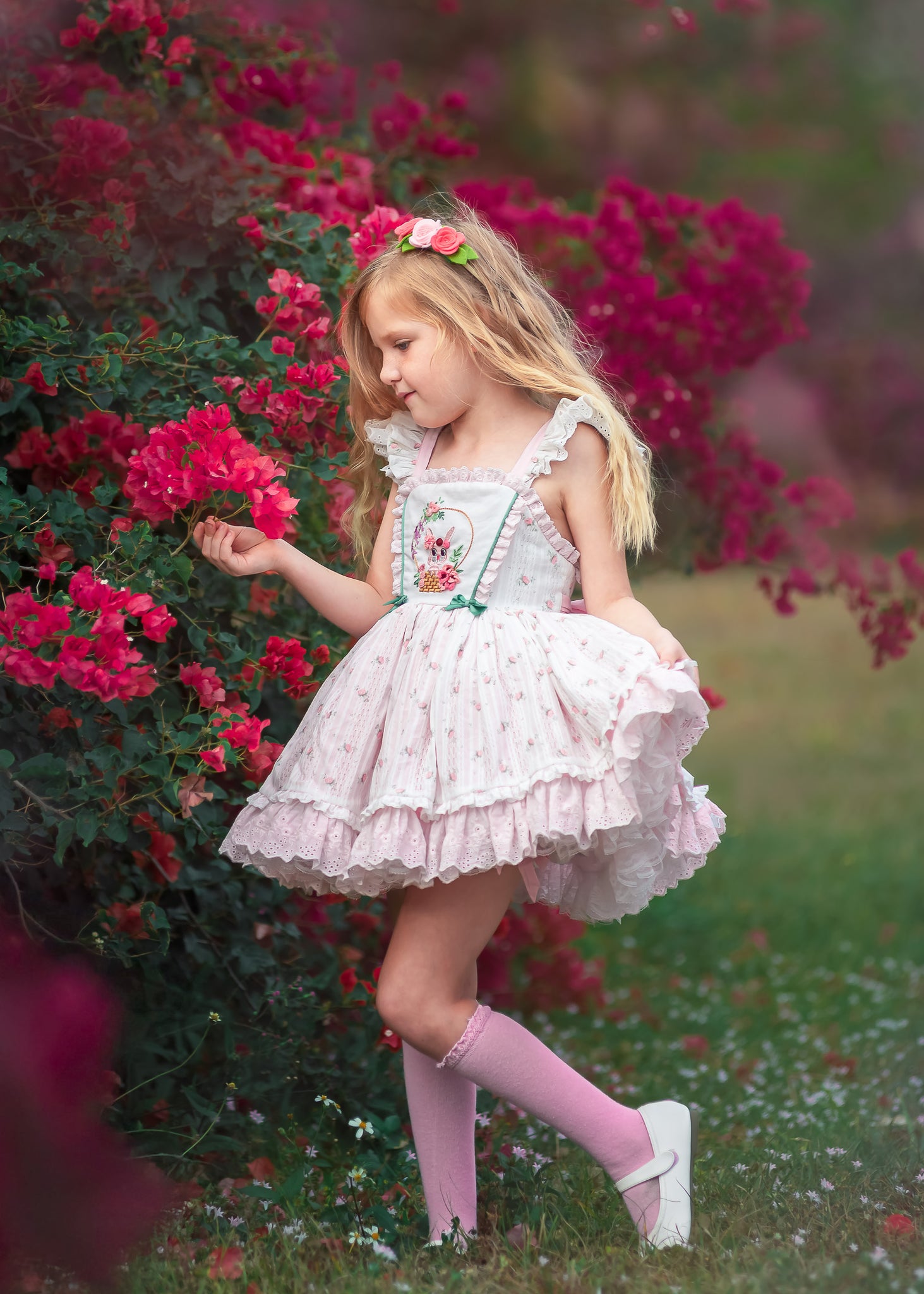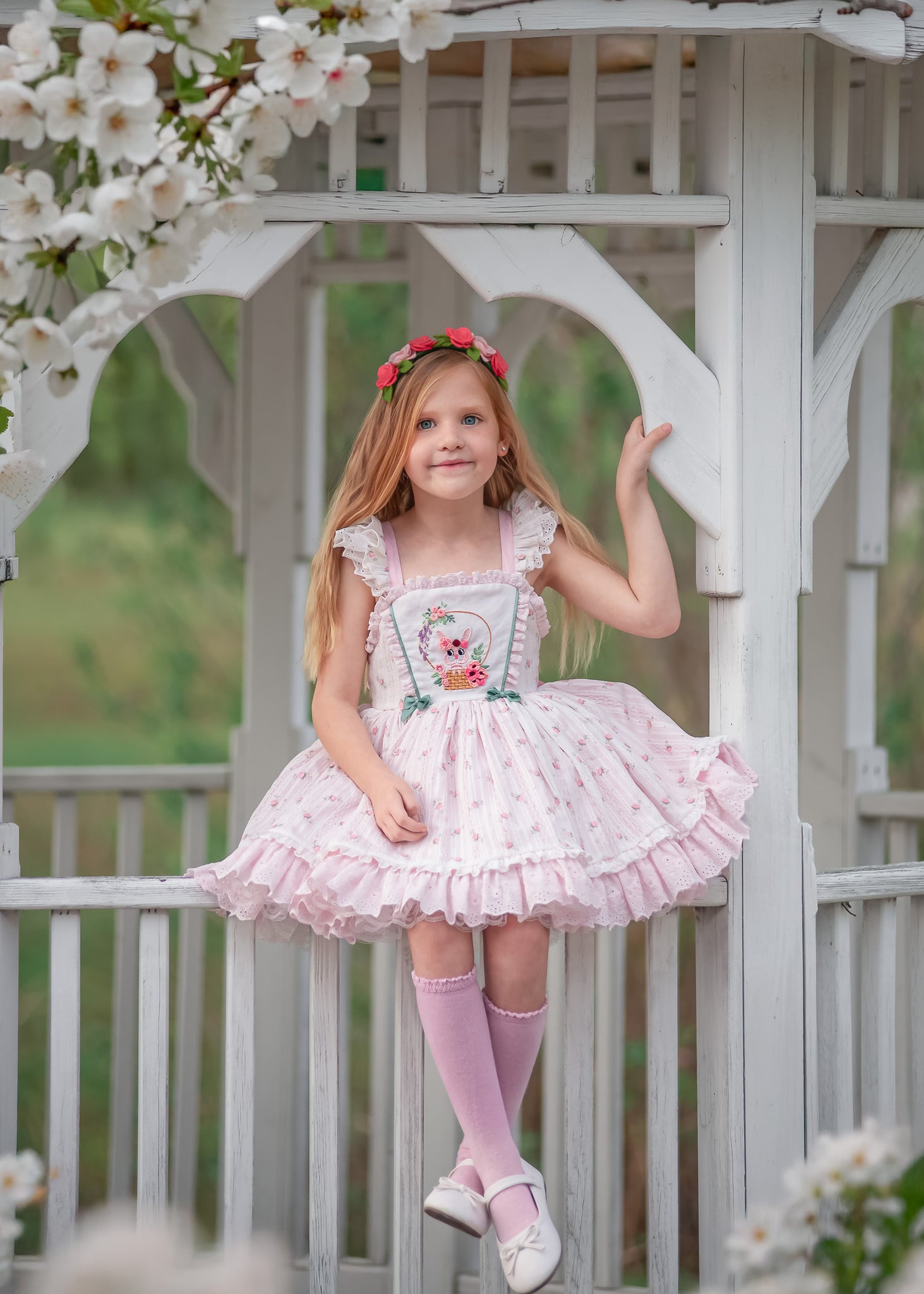 This adorable dress features lovely hand and machine embroidery accent on the bodice of a bunny in a basket with florals. The bodice also is trimmed in eyelet and has double flutter sleeves. It has elastic in back with a big bow for tying and adjusting fit. Straps also adjust. The fabric is a printed white dimity with pink florals. It comes with pink eyelet trim underskirt and eyelet at the hemline of the overskirt. The Dress is fully lined with a sewn in petticoat and comes with bloomers!