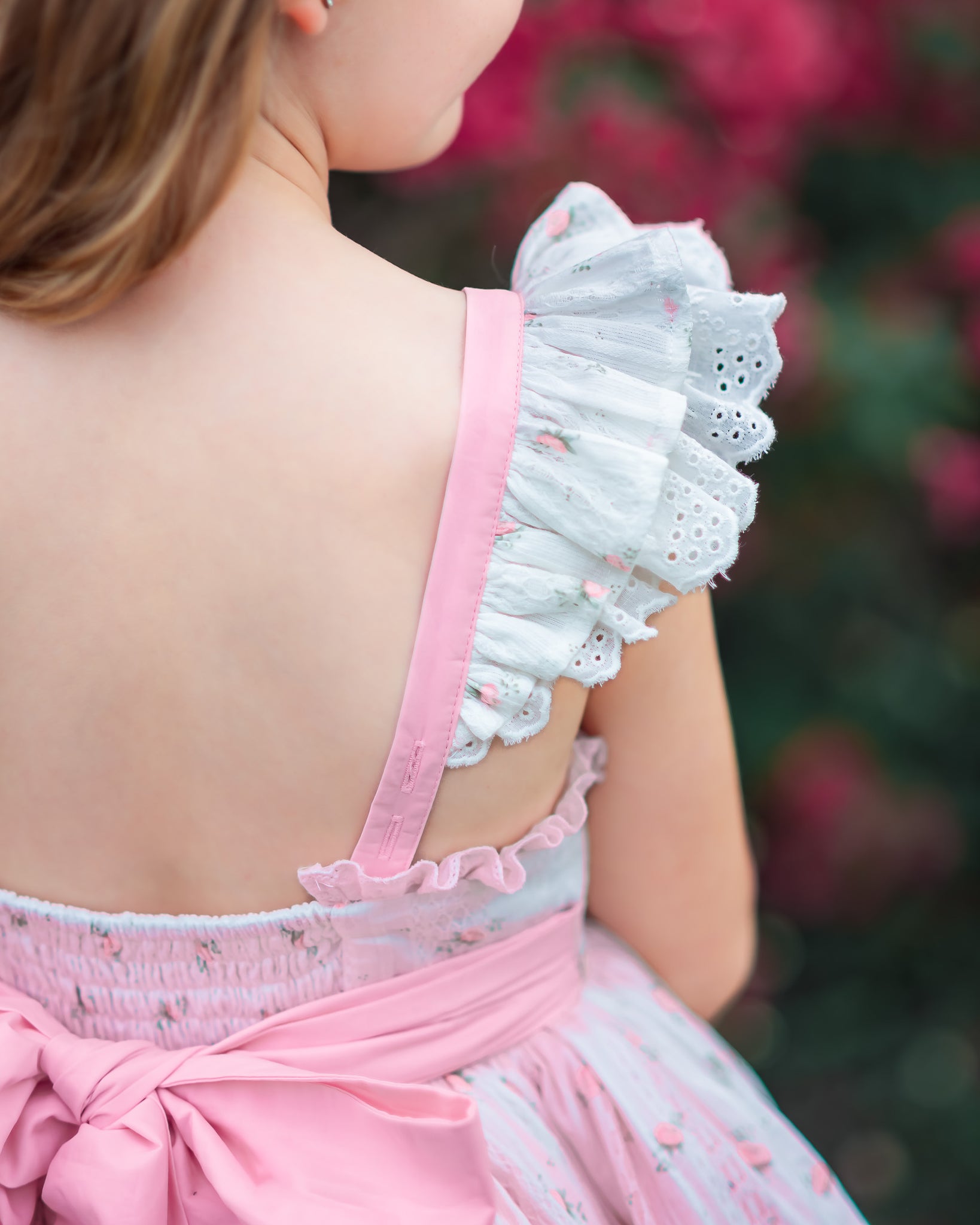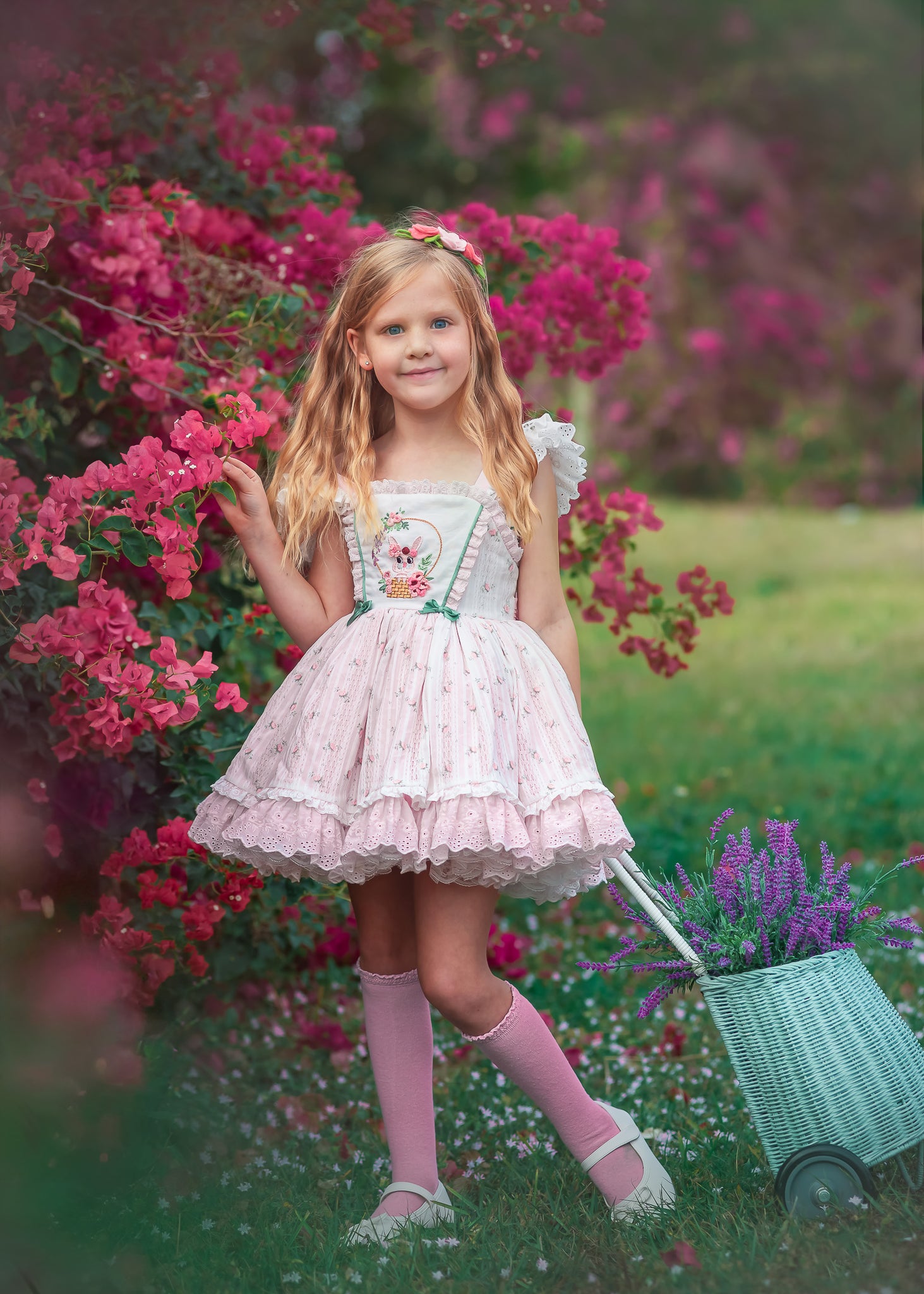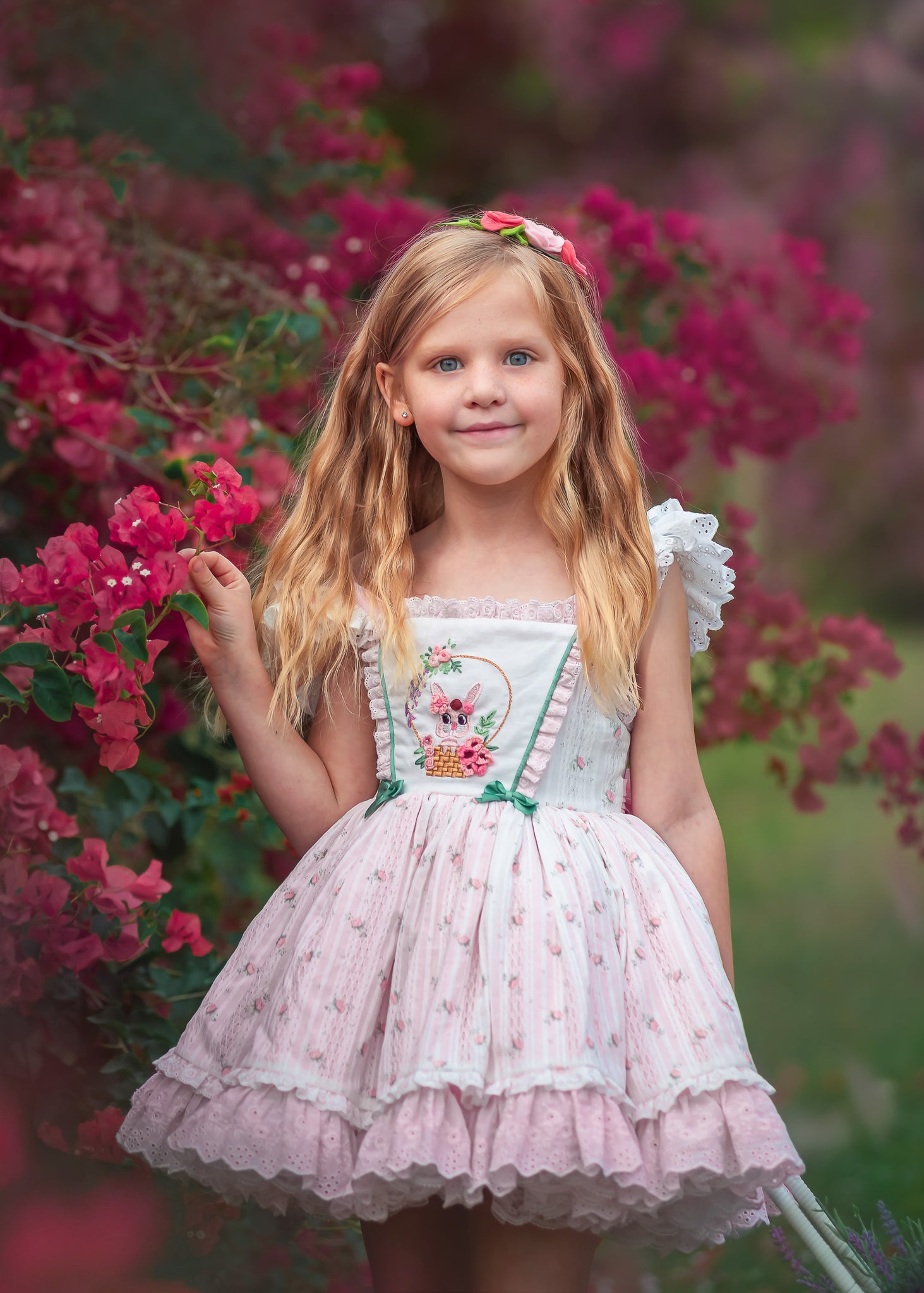 This adorable dress features lovely hand and machine embroidery accent on the bodice of a bunny in a basket with florals. The bodice also is trimmed in eyelet and has double flutter sleeves. It has elastic in back with a big bow for tying and adjusting fit. Straps also adjust. The fabric is a printed white dimity with pink florals. It comes with pink eyelet trim underskirt and eyelet at the hemline of the overskirt. The Dress is fully lined with a sewn in petticoat and comes with bloomers!