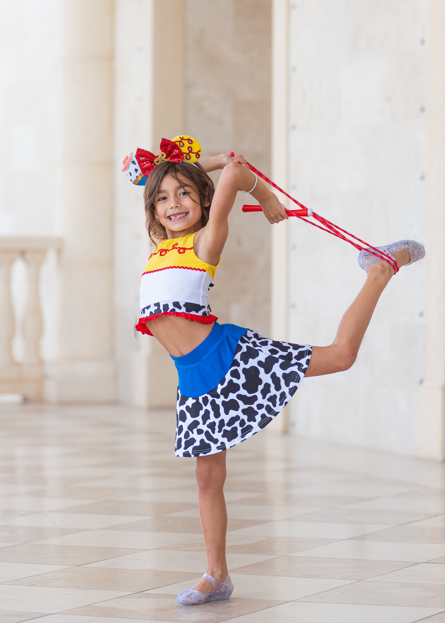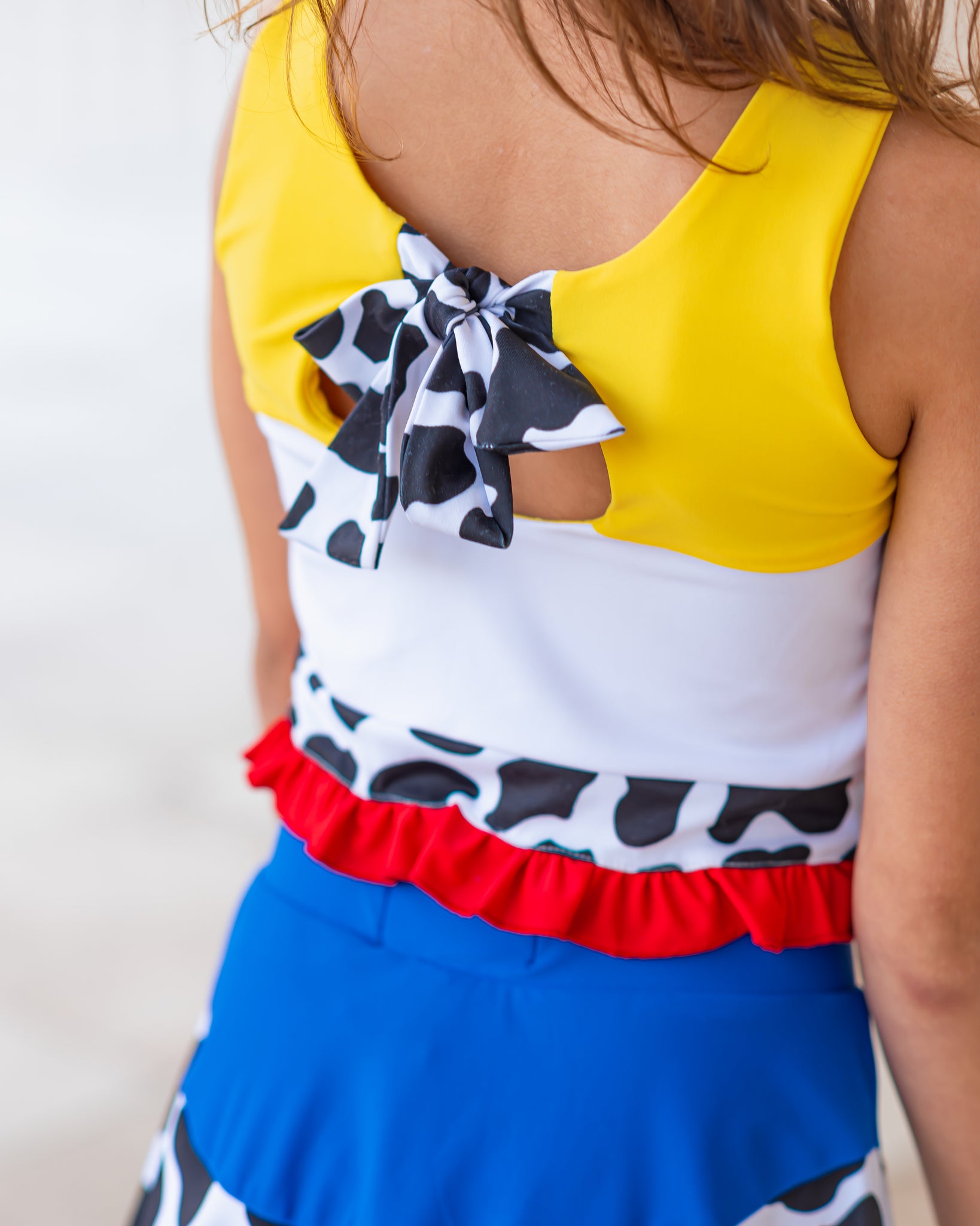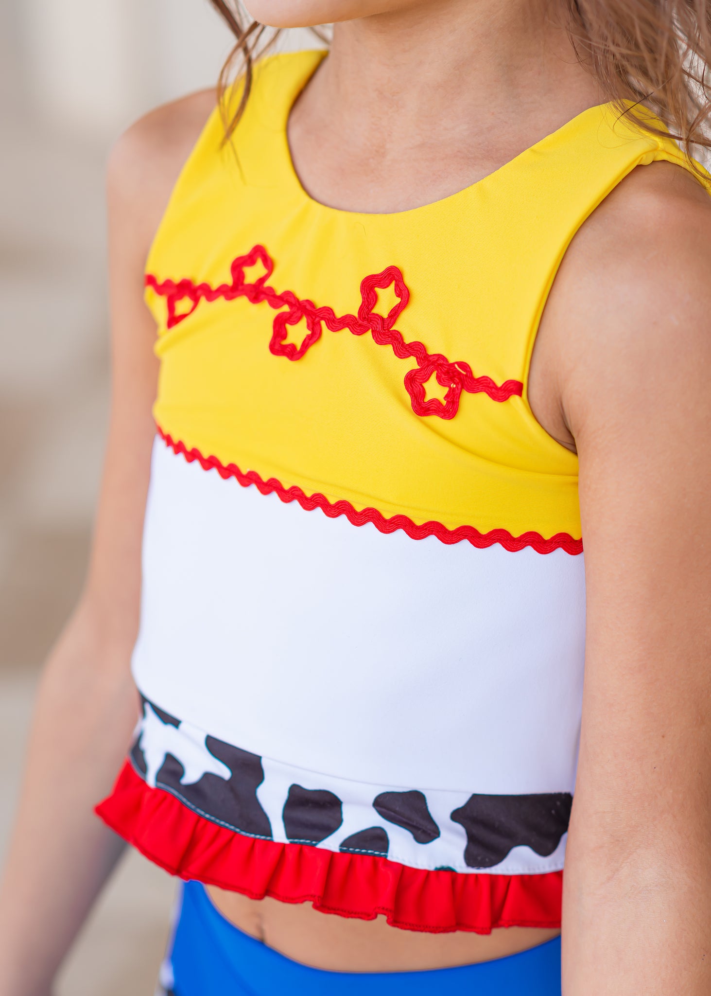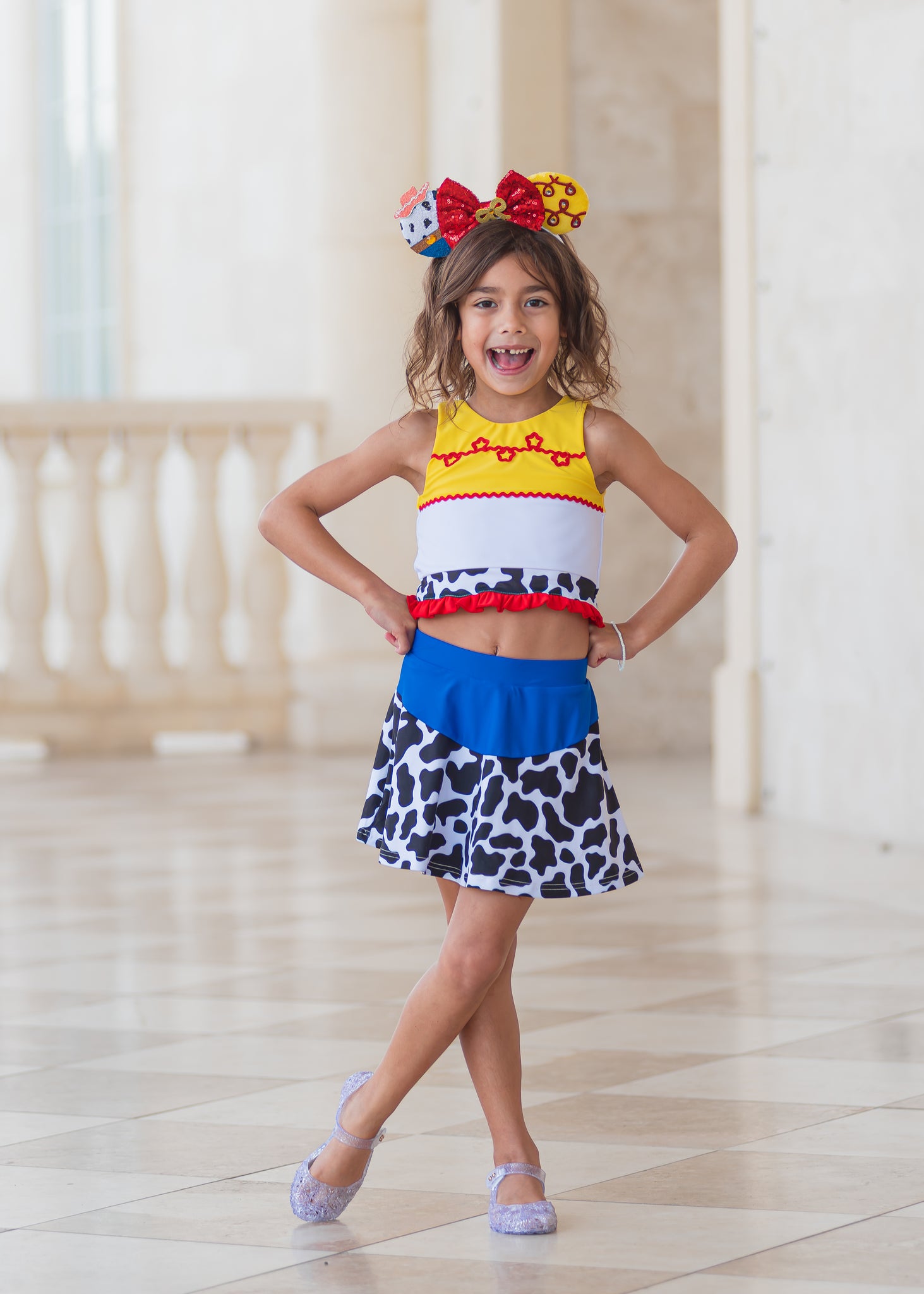 Inspired by our favorite cowgirl, this set includes fun details like rickrack trimming, cow print, and an adorable bow in the back of the shirt. Skirt includes sewn in shorts underneath