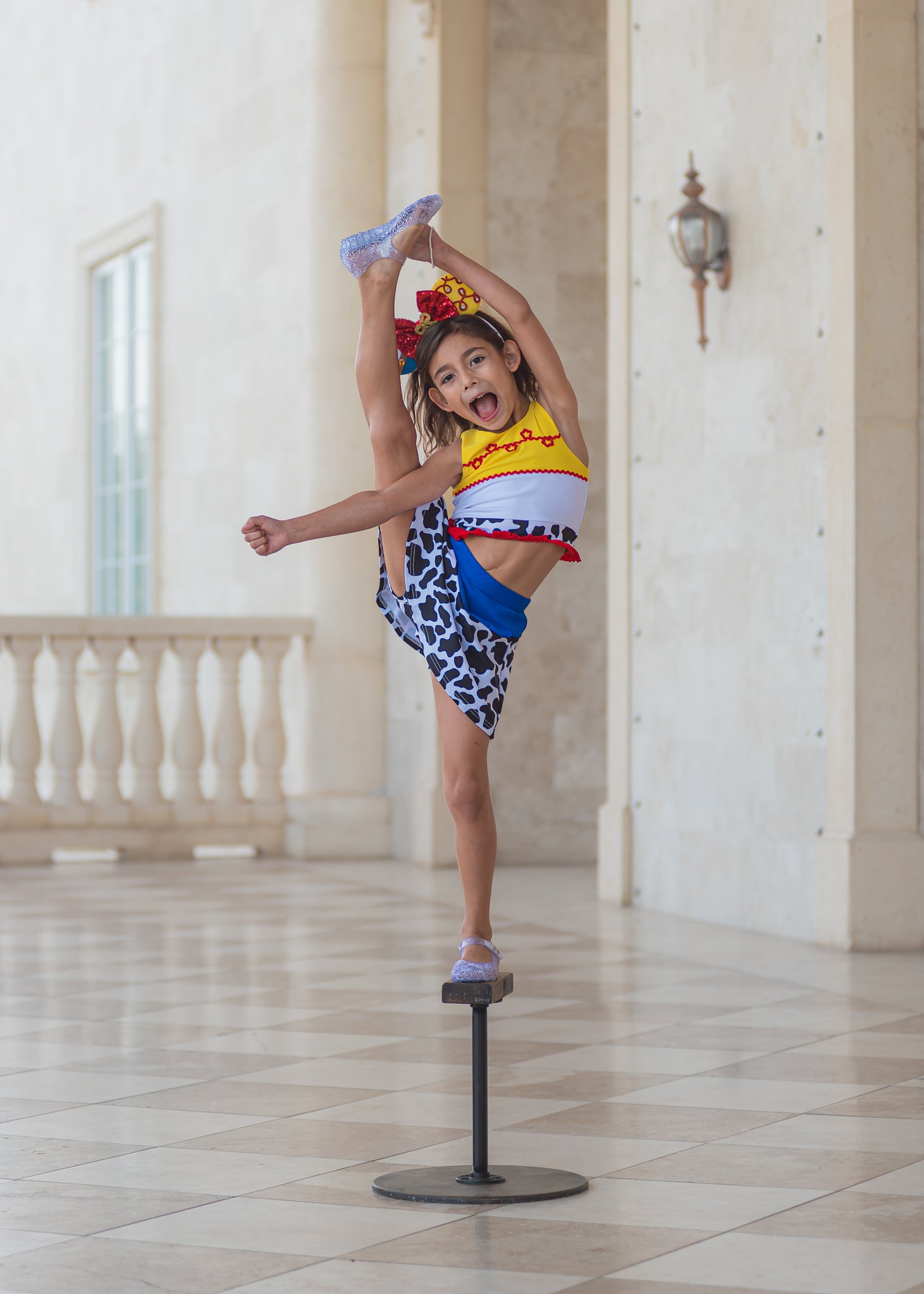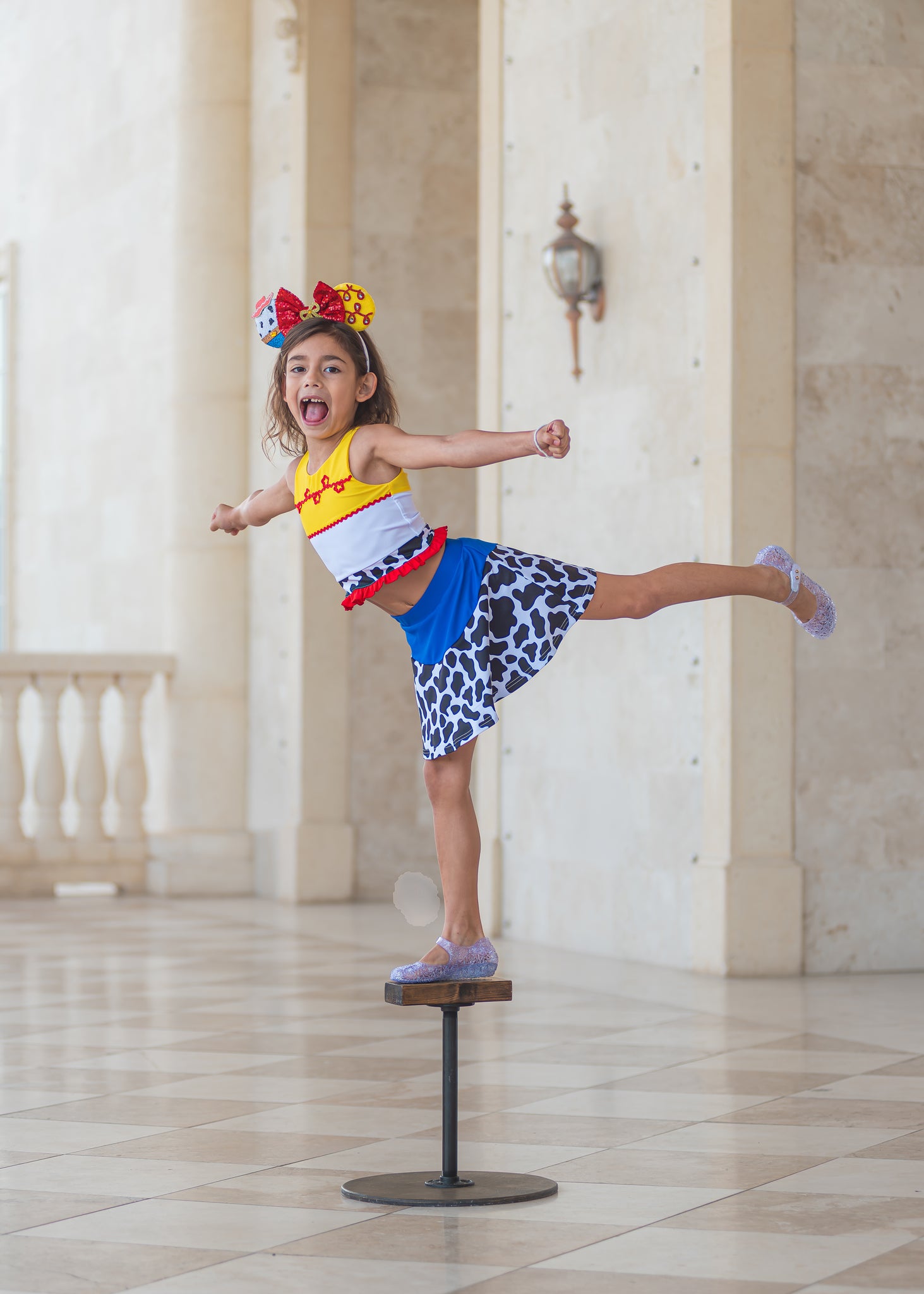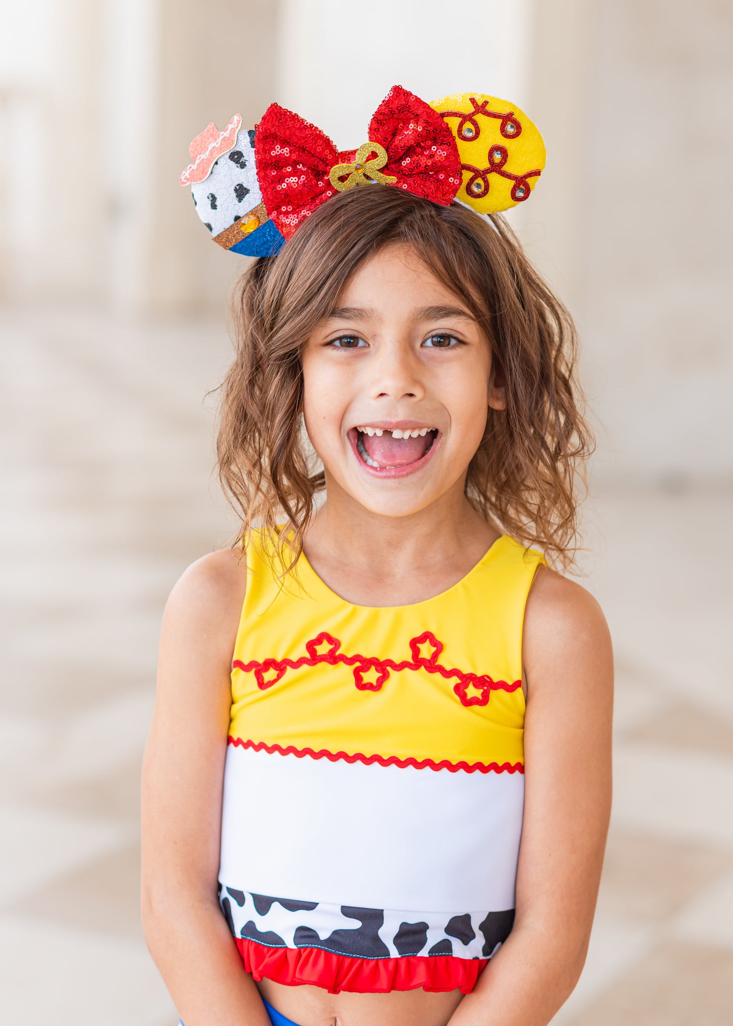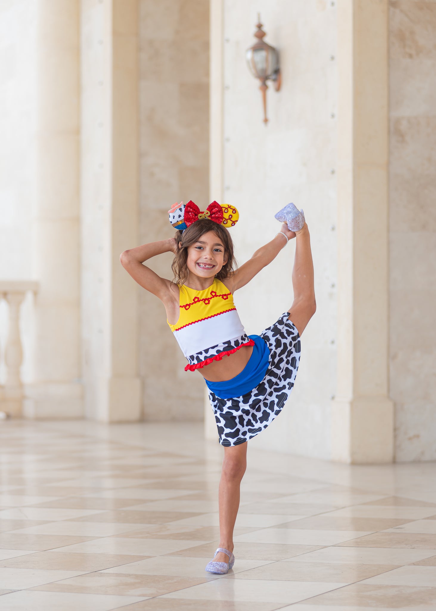 Inspired by our favorite cowgirl, this set includes fun details like rickrack trimming, cow print, and an adorable bow in the back of the shirt. Skirt includes sewn in shorts underneath