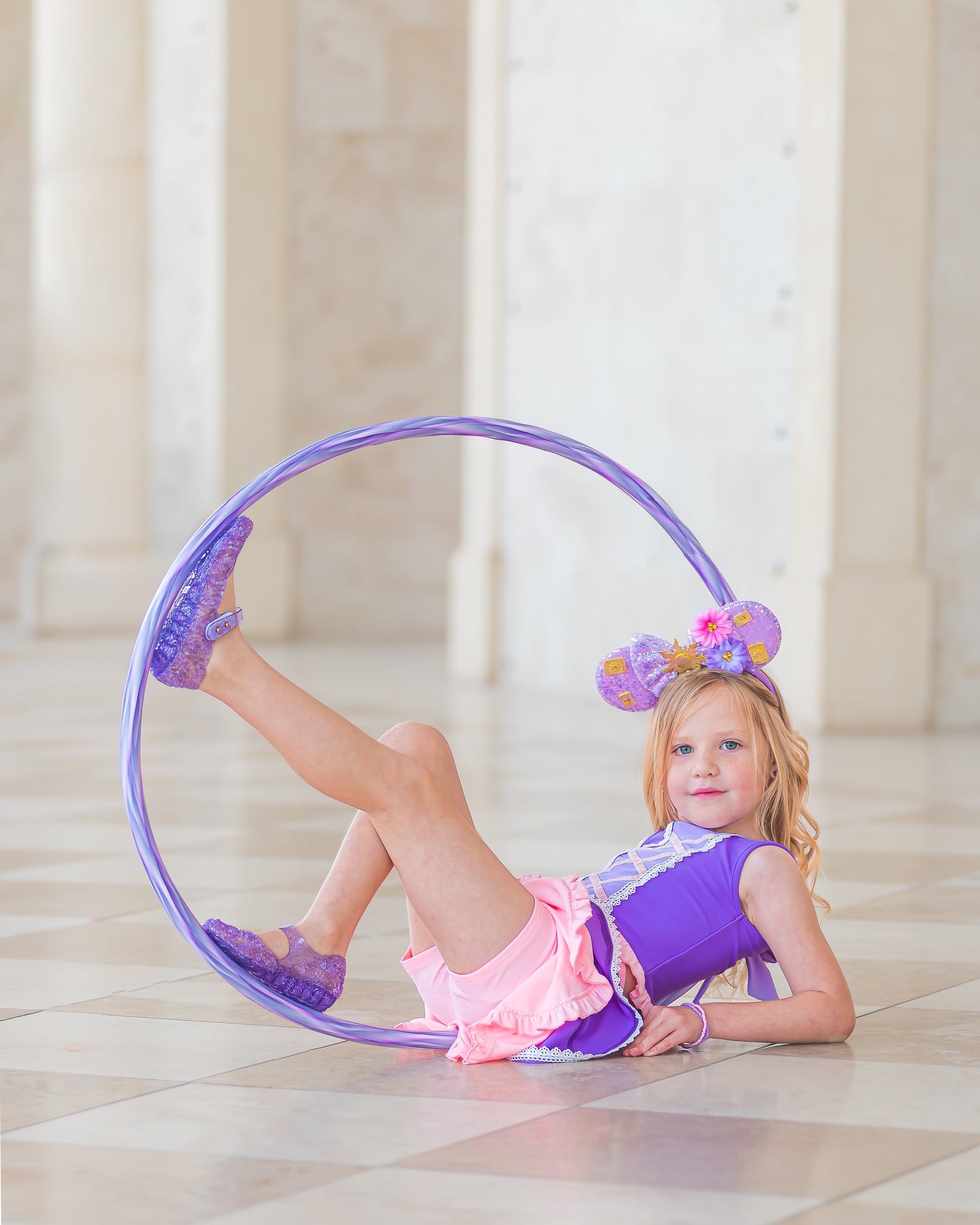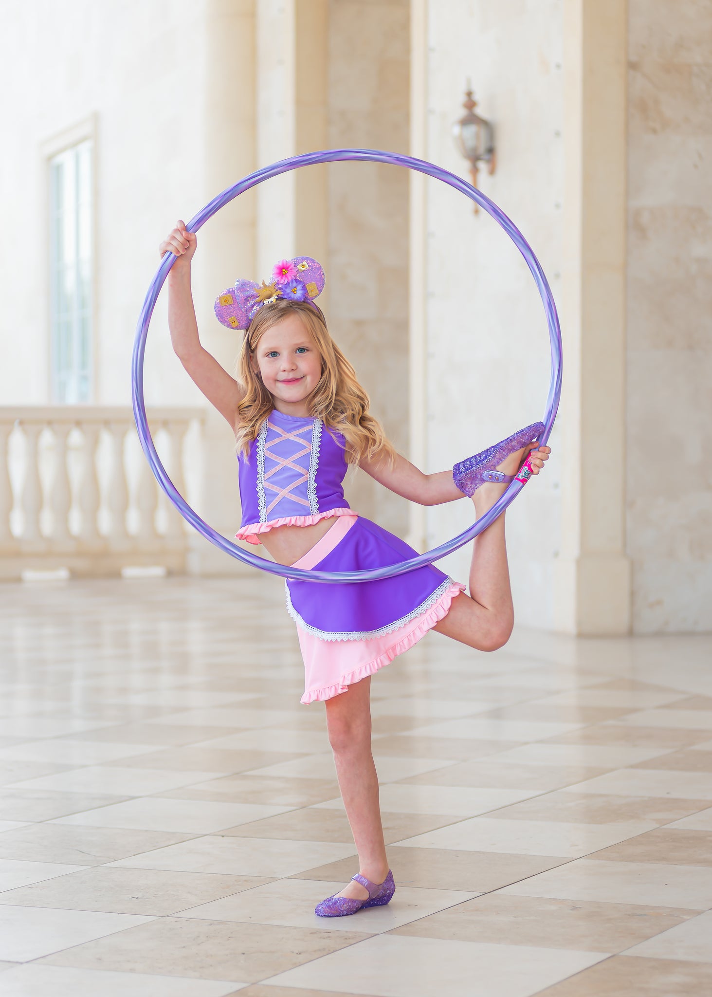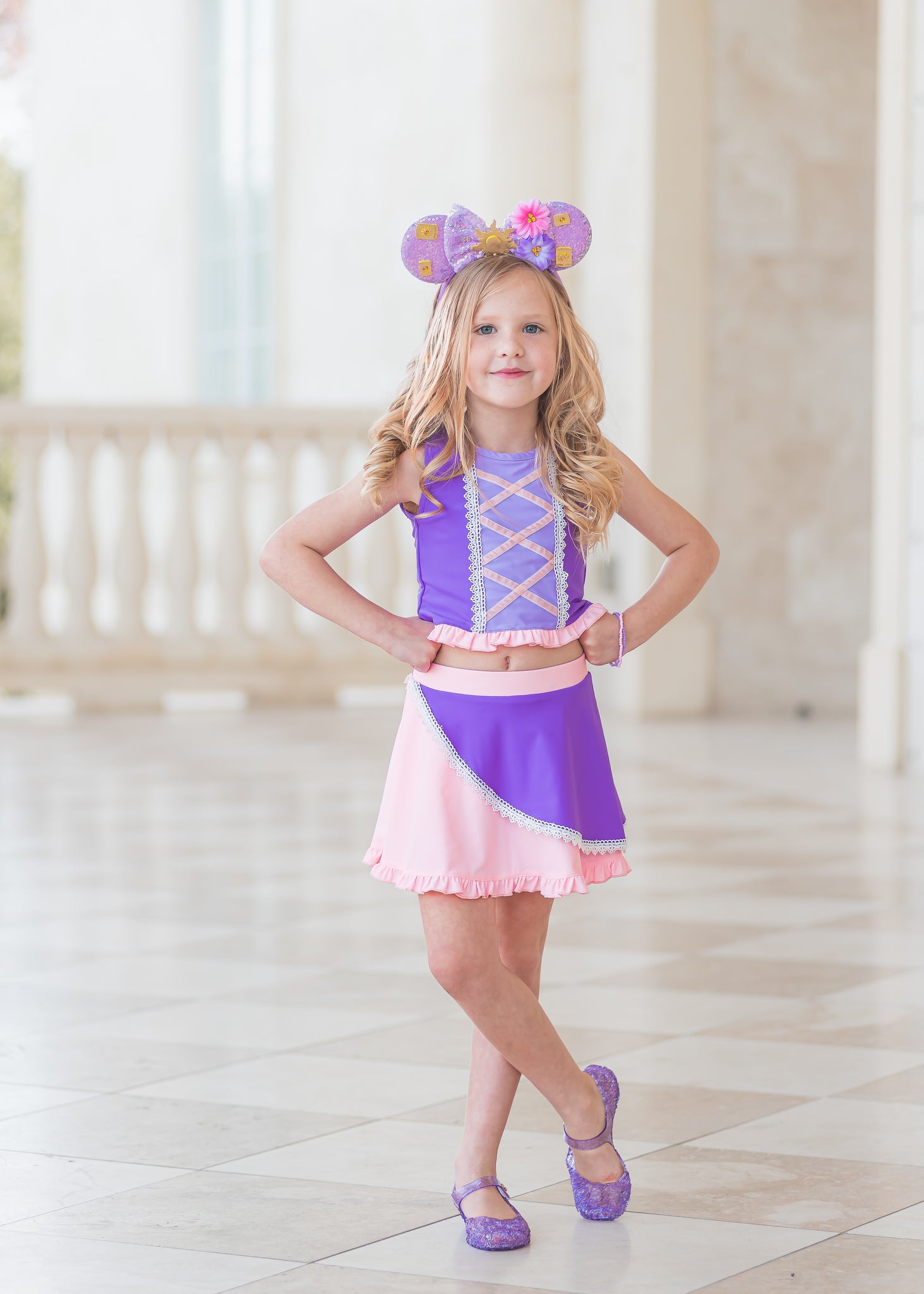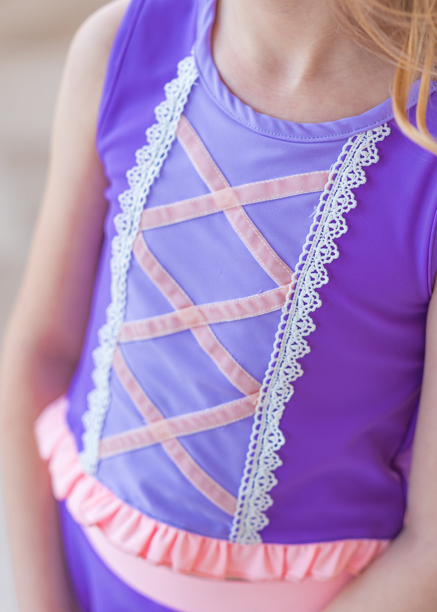 Our favorite long haired beauty is emulated by her mixes of pinks and purples in this comfortable athletic set. It has a faux lace up shirt with lace, an adorable back bow and ruffle trim. It has an asymmetrical top skirt with lace trimming and ruffle hemline. The skirt includes sewn in shorts underneath.