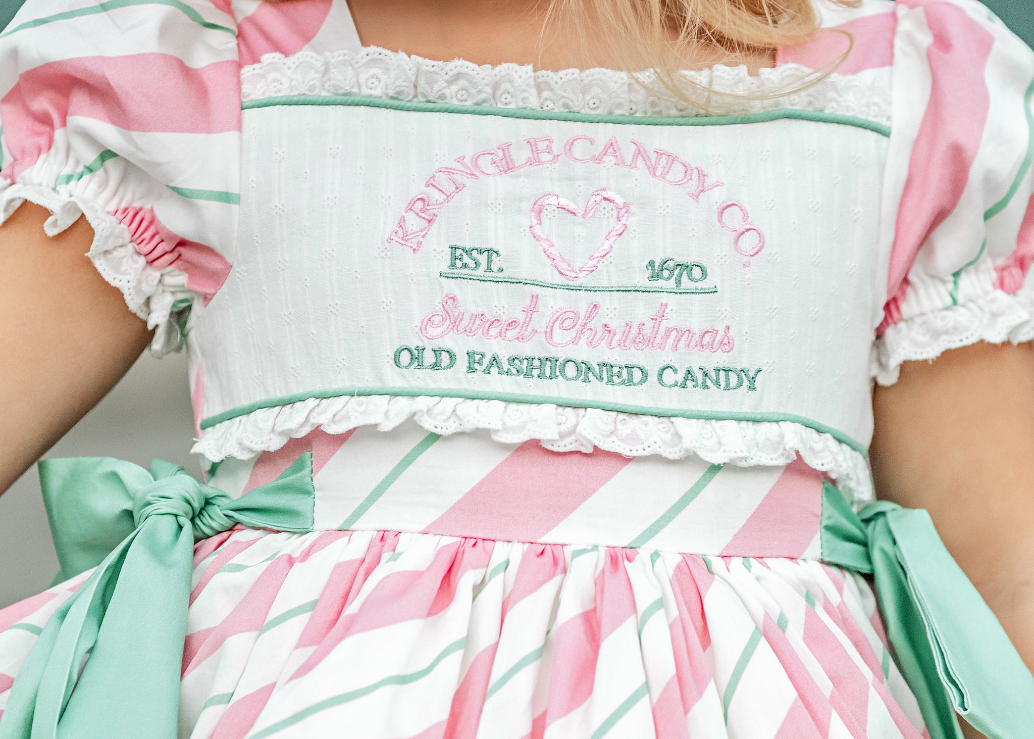 This adorable candy cane inspired dress includes multi layers of cotton fabric in light pink and mint green tones. The bodice has adorable embroidery detailed in mint piping and eyelet. It has darling puff sleeves with eyelet hems. Sides of the dress have mint green ties to tighten. Back has adorable fabric covered button closure. The skirt showcases darling candy cane embroidered pockets with eyelet at the hemline. Underskirt is pink with pink eyelet trim. Dress comes fully lined with lined bloomers and with full cotton layer and generous ruffles to add volume but does not come with a petticoat sewn in. If you wish to purchase separately, please select it from the drop down menu.
