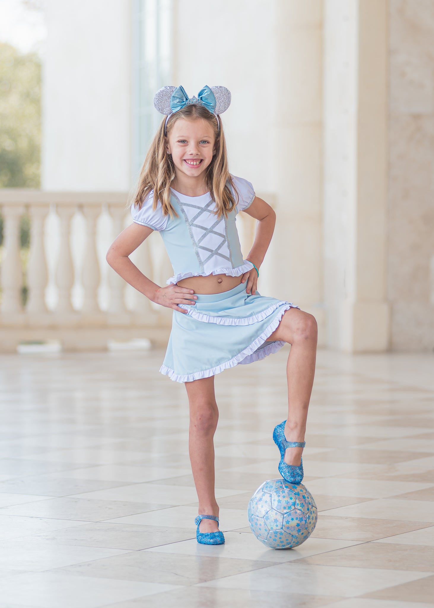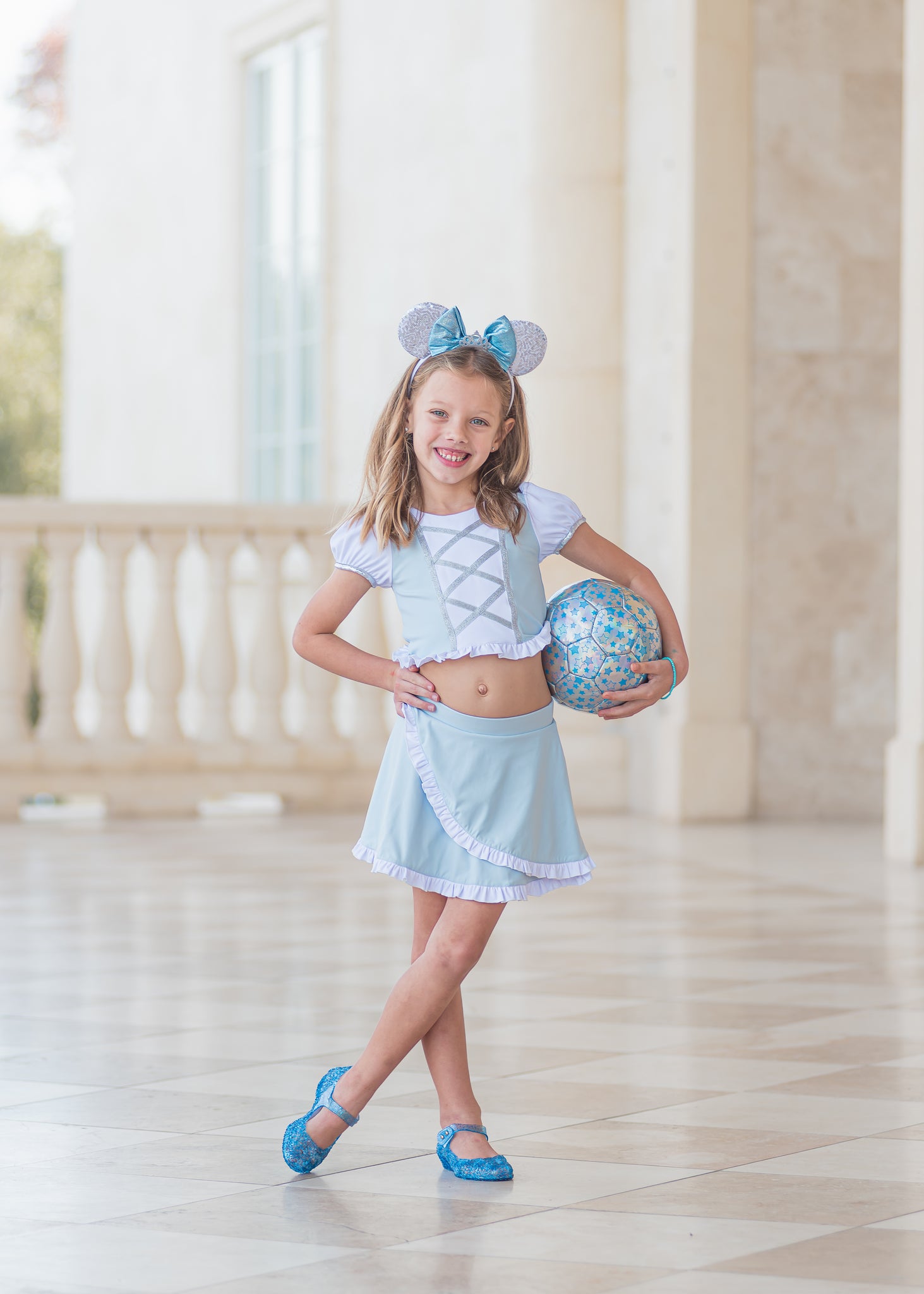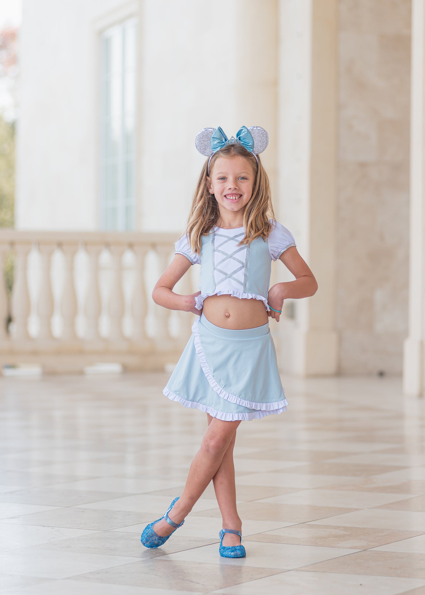 It’s like stepping into a fairytale or more like stepping through parks in style ! This outfit is made with athletic material and made for all day comfort. It has a faux lace up front, ruffle hem, and puff sleeves. Back has an adorable criss cross pattern. Skirt has a ruffle hem and cross over design. The skirt includes sewn in shorts underneath.
