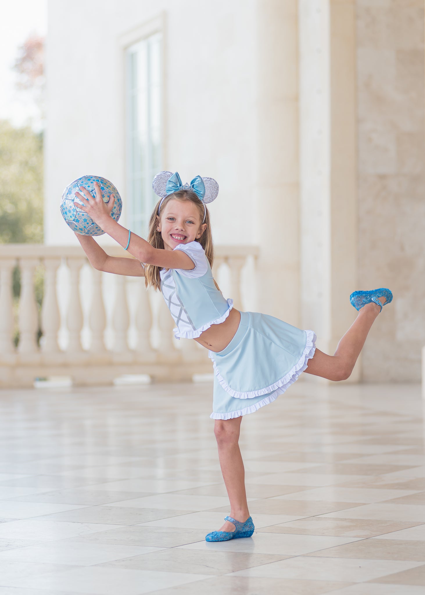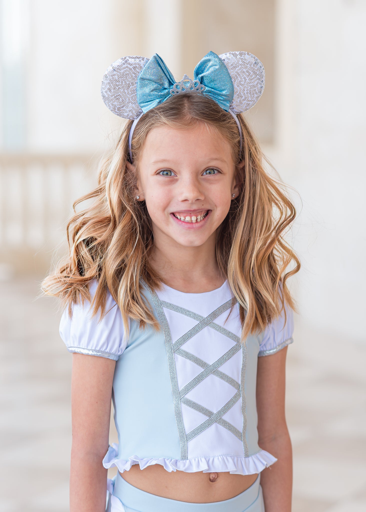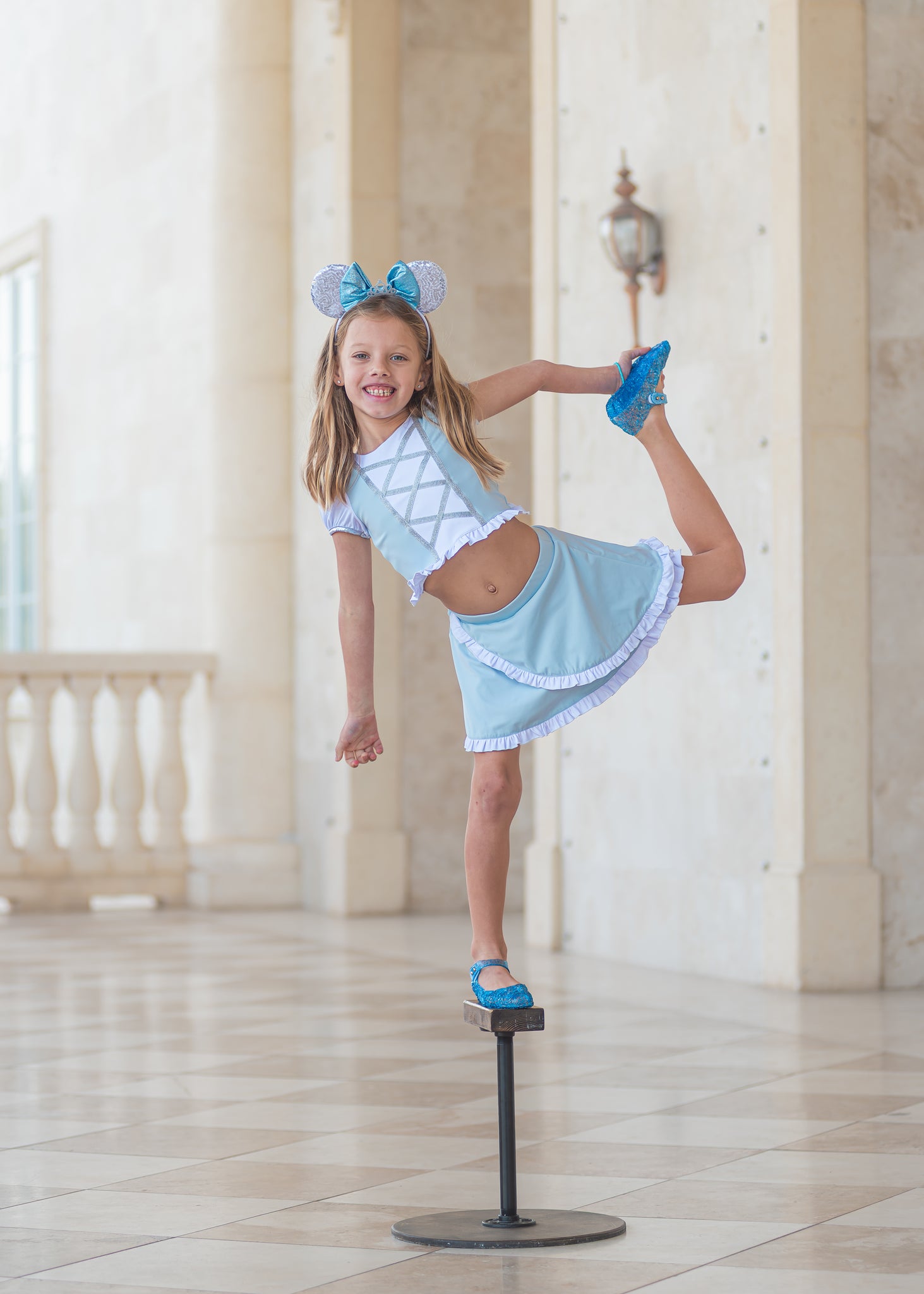 It’s like stepping into a fairytale or more like stepping through parks in style ! This outfit is made with athletic material and made for all day comfort. It has a faux lace up front, ruffle hem, and puff sleeves. Back has an adorable criss cross pattern. Skirt has a ruffle hem and cross over design. The skirt includes sewn in shorts underneath.