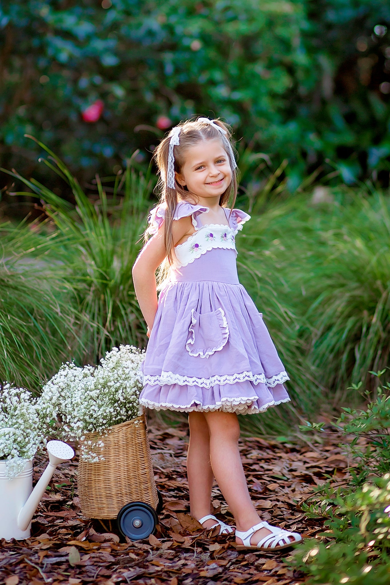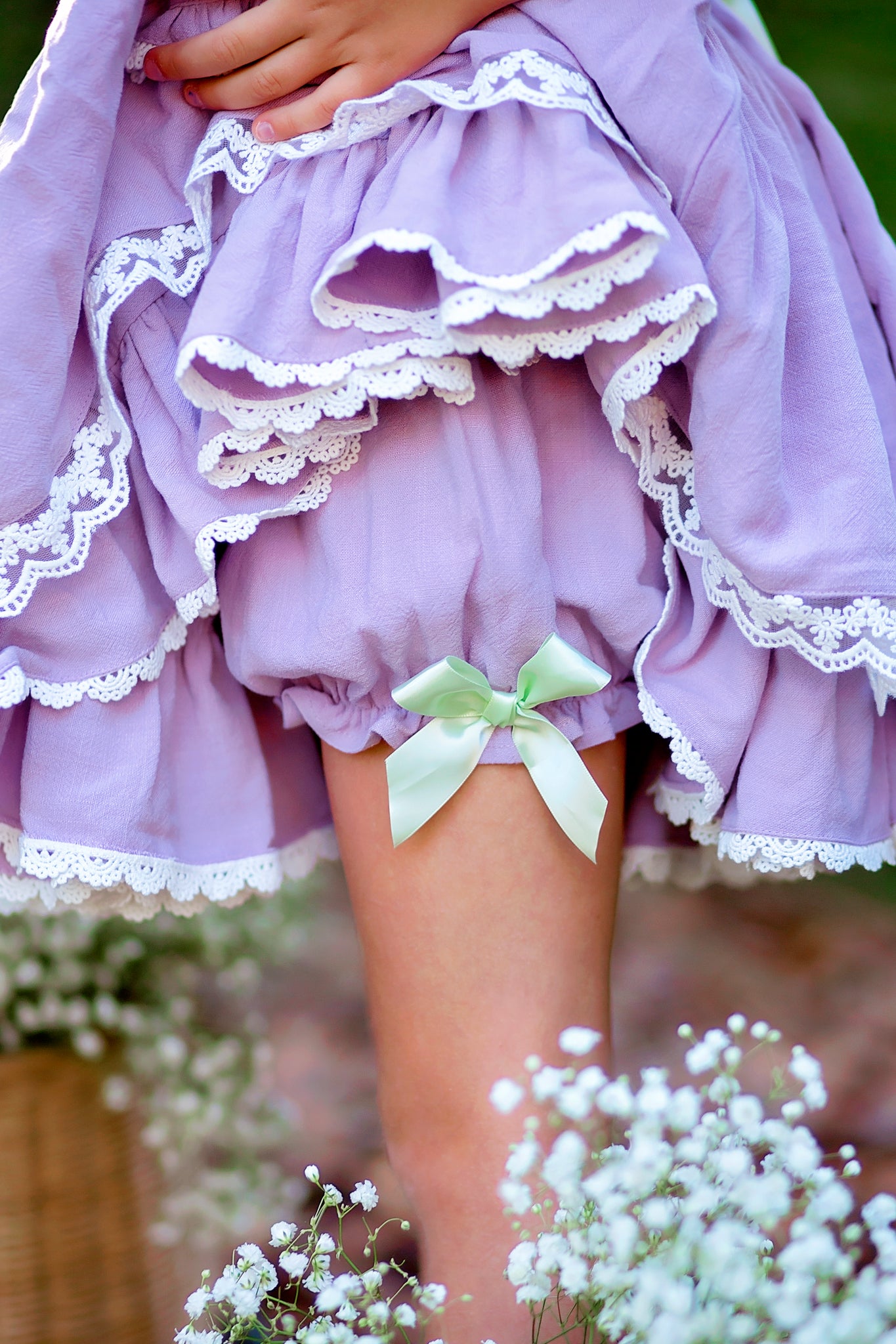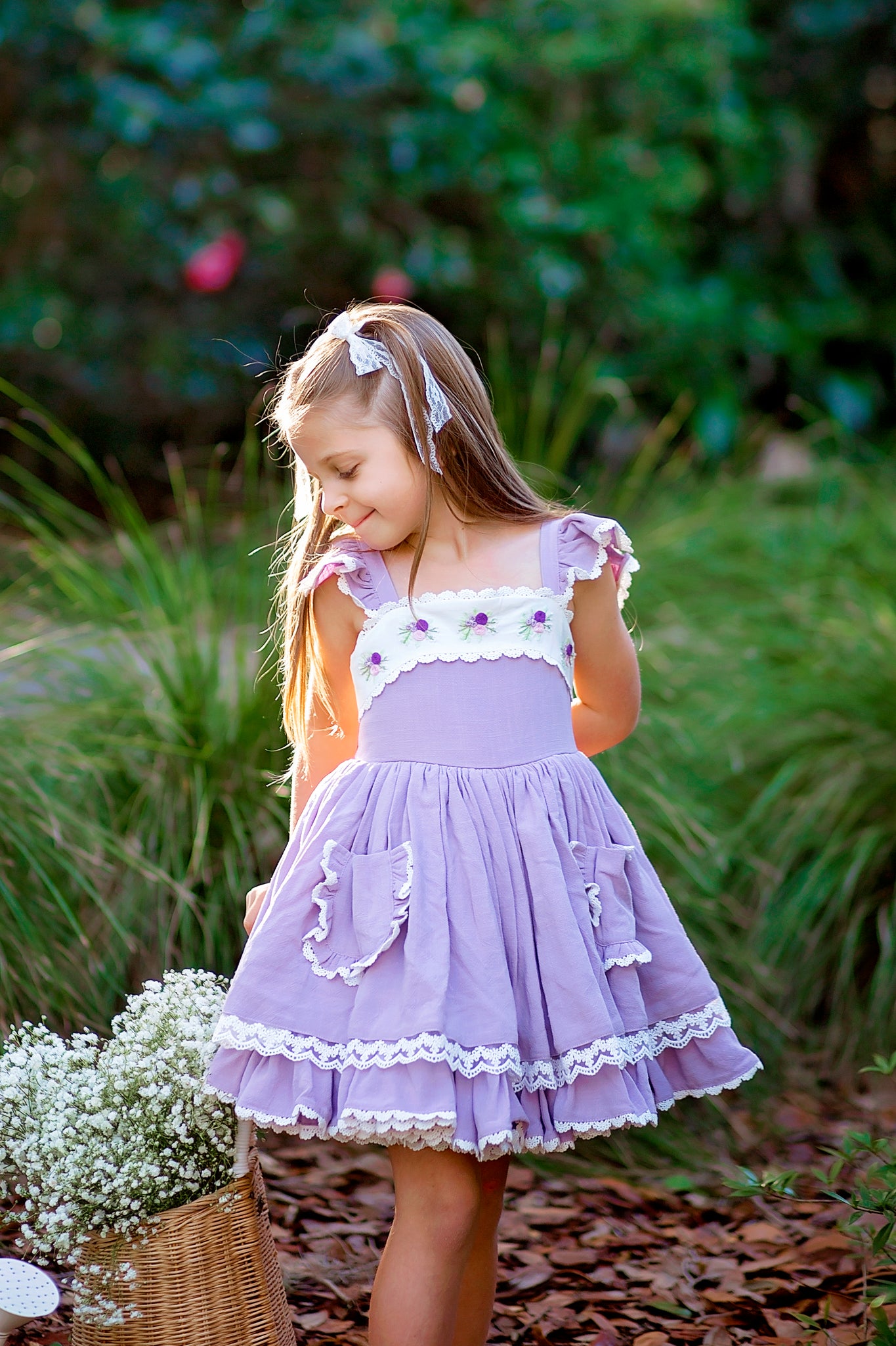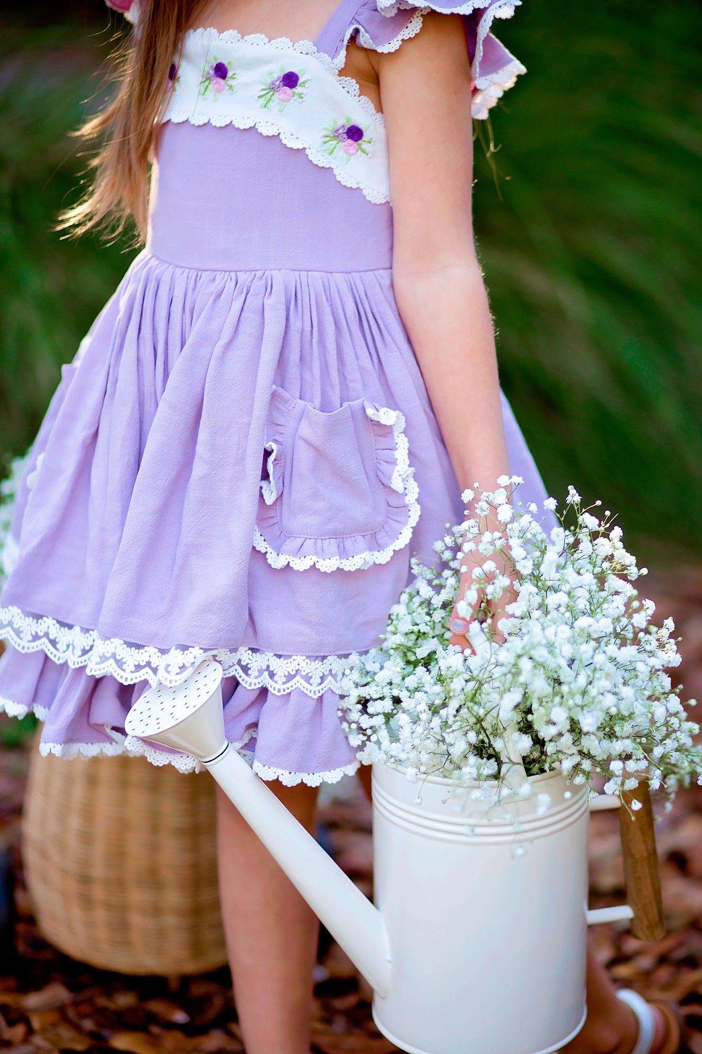 This dress features gorgeous 100% linen fabric in lavender. It has hand embroidered flowers around the top bodice that is trimmed in lace. The straps have flutter sleeves with lace trim. Skirt is two layers of linen with underskirt having a full ruffle hem. Skirt also has adorable pockets with ruffles and more lace! Back of dress has elastic and also has a corset tie with green satin ribbon for an added punch of green. Dress comes fully lined with bloomers! Optional add on petticoat will be available in the drop down menu and will come as a separate piece.