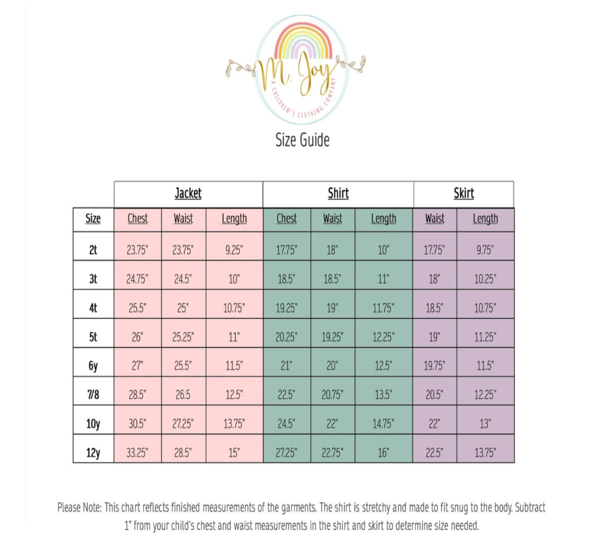 Your little one will be ready to fight some demons in this three piece set! Jacket is made with black sequin fabric and coming trimmed to the max with adorable removable shoulder epaulettes. The shirt is made with shimmery stretch fabric with gold trim and button. Back of shirt has a small keyhole on the upper back to include a button closure around the neckline. The skirt is pleated, has chain trims, and made with stretch fabrics. BONUS: It also has shorts sewn in making it technically a skort!