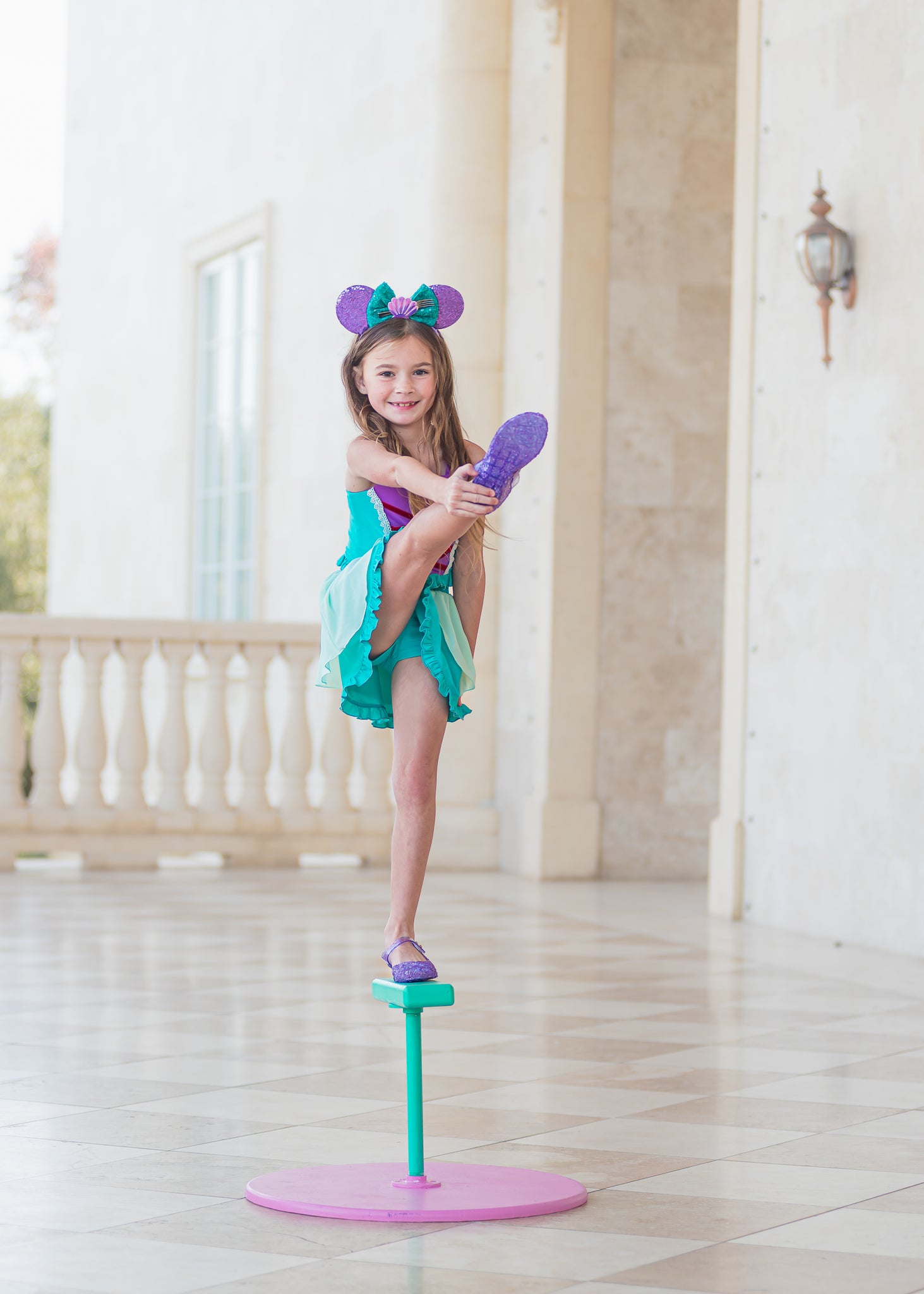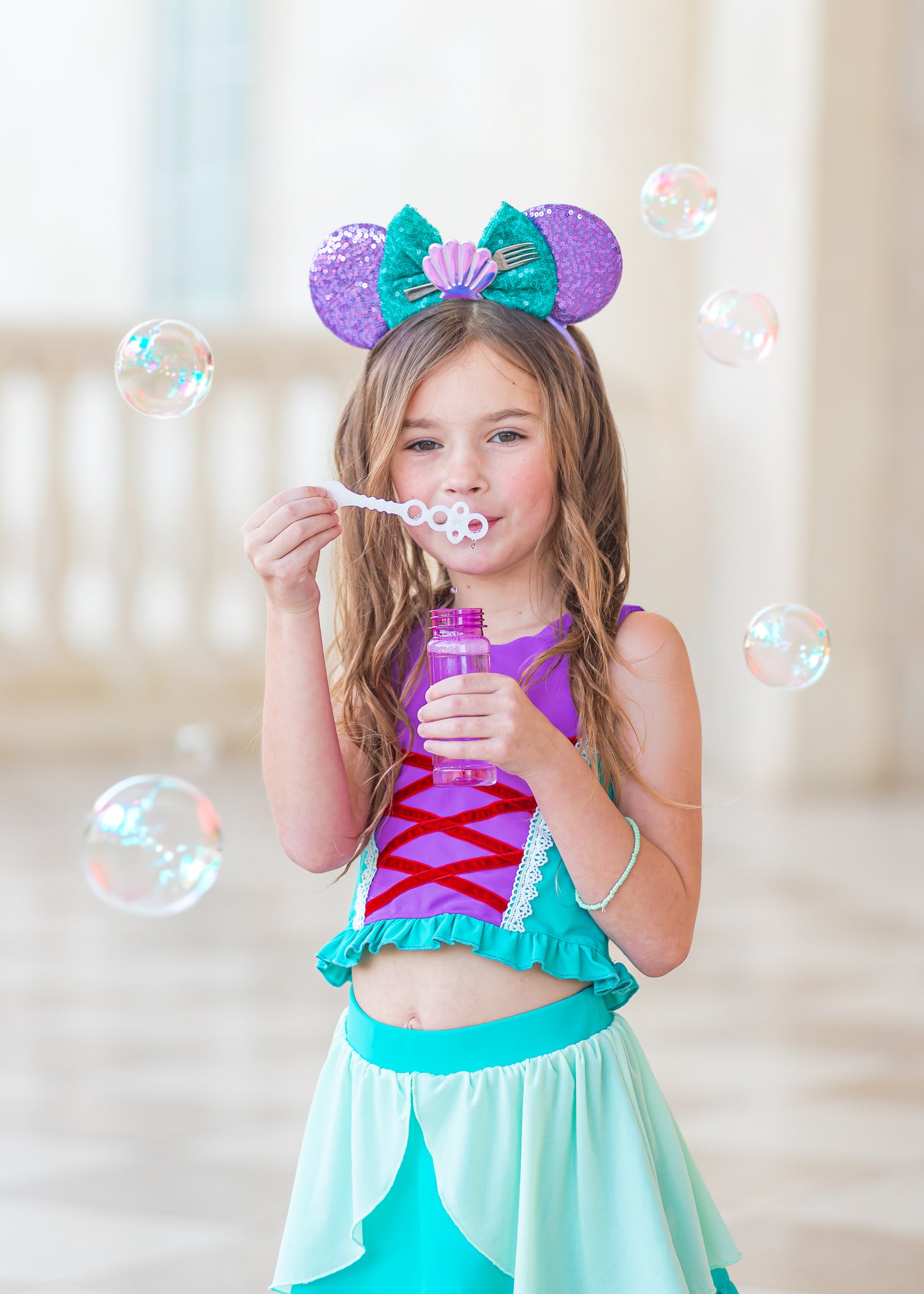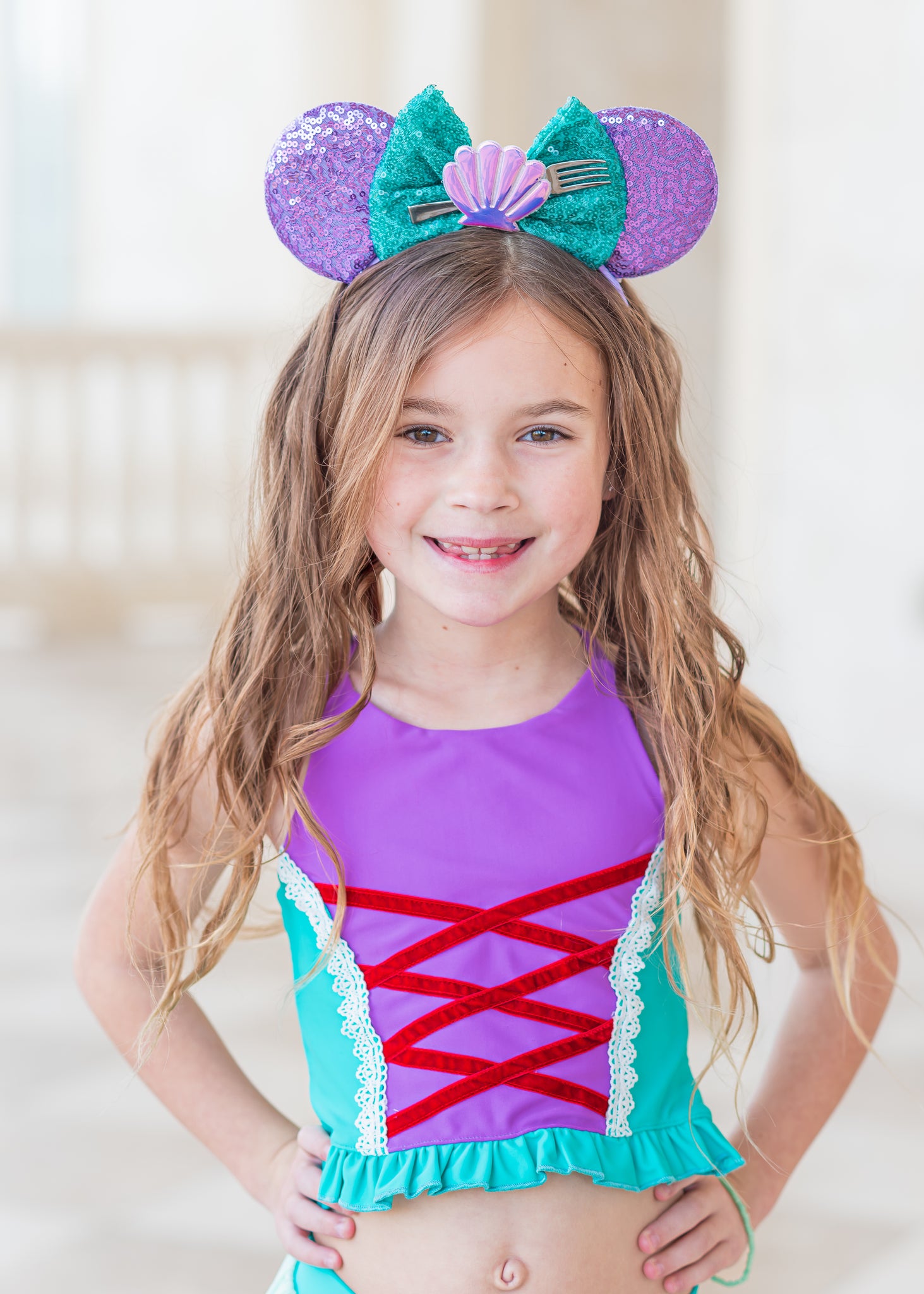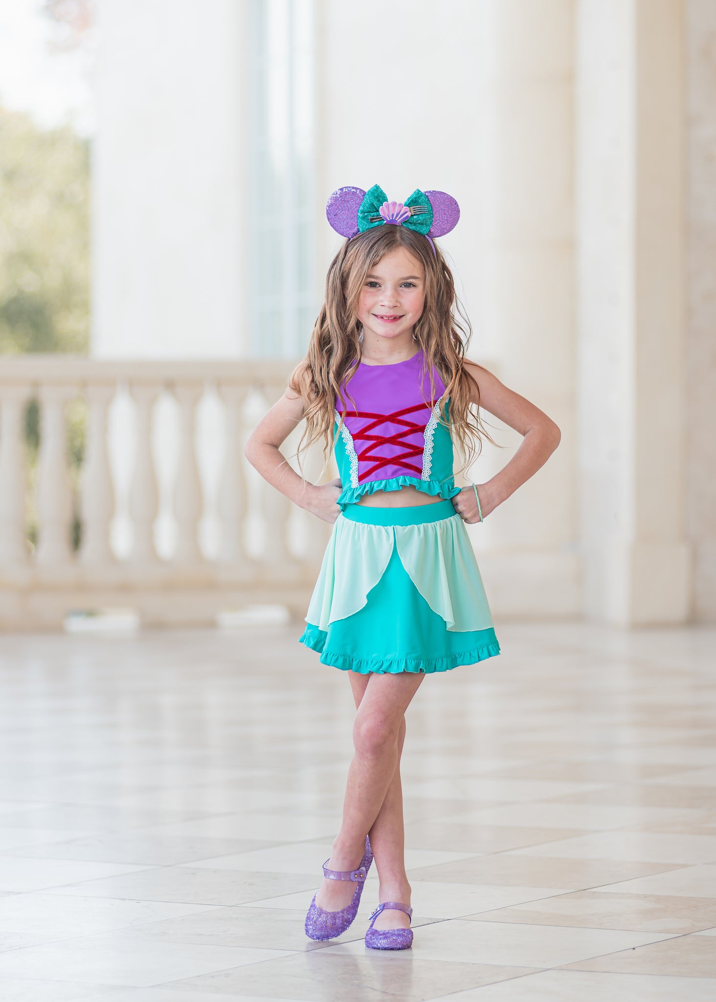 Mermaid Magic has adjustable straps, faux lace up front, ruffles, and mesh overlay! The skirt includes sewn in shorts underneath.
